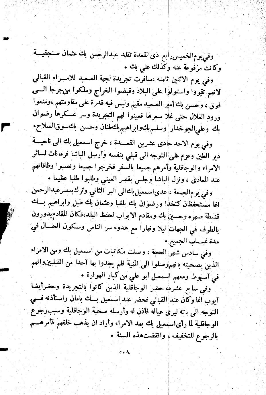 وفي سابع عشرة حضر الوجاقلية الذين بالتجريدة وحضر أيضا أيوب اغا وكان عند القبالي فحضر عند إسمعيل بك بأمان وأستاذنه في التوجه إلى بيته ليرى عياله فأذن له وأرسله صحبة الوجاقلية وسبب رجوع الوجاقلية لما رأى إسمعيل بك بعد الأمراء وأراد أن يذهب خلفهم فأمرهم بالرجوع للتخفيف وانقضت هذه السنة.