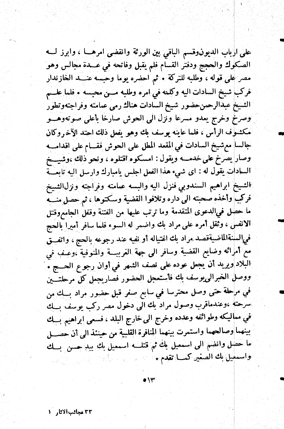 على أرباب الديون وقسم الباقي بين الورثة وانقضى أمرها وابرز له الصكوك والحجج ودفتر القسام فلم يقبل وفاتحه في عدة مجالس وهو مصر على قوله وطلبه للتركة. ثم أحضره يوما وجبسه عند الخازندار فركب شيخ السادات إليه وكلمه في أمره وطلبه من محبسه. فلما علم الشيخ عبد الرحمن حضور شيخ السادات هناك رمى عمامته وفراجته وتطور وصرخ وخرج يعدو مسرعا ونزل إلى الحوش صارخا بأعلى صوته وهو مكشوف الرأس فلما عاينه يوسف بك وهو يفعل ذلك احتد الآخر وكان جالسا مع شيخ السادات في المقعد المطل على الحوش فقام على اقدامه وصار يصرخ على خدمه ويقول: امسكوه اقتلوه ونحو ذلك وشيخ السادات يقول له: أى شيء هذا الفعل اجلس يا مبارك وأرسل إليه تابعه الشيخ إبراهيم السندوبي فنزل إليه والبسه عمامته وفراجته ونزل الشيخ فركب وأخذه صحبته إلى داره وتلافوا القضية وسكتوها ثم حصل منه ما حصل في الدعوى المتقدمة وما ترتب عليها من الفتنة وقفل الجامع وقتل الانفس وثقل أمره على مراد بك واضمر له السوء فلما سافر أميرا بالحج في السنة الماضية قصد مراد بك اغتياله أو نفيه عند رجوعه بالحج واتفق مع أمرائه وضايع القضية وسافر إلى جهة الغريبة والمنوفية وعسف في البلاد ويريد أن يجعل عوده على نصف الشهر في أوان رجوع الحج. ووصل الخبر إلى يوسف بك فأستعجل الحضور فصار يجعل كل مرحلتين في مرحلة حتى وصل محترسا في سابع صفر حضور مراد بك من سرحته وعندما قرب وصول مراد بك إلى دخول مصر ركب يوسف بك في مماليكه وطوائفه وعدده وخرج إلى خارج البلد فسعى إبراهيم بك بينهما وصالحهما واستمرت بينهما المنافرة القلبية من حينئذ إلى أن حصل ما حصل وانضم إلى إسمعيل بك ثم قتله إسمعيل بك بيد حسن بك وإسمعيل بك الصغير كما تقدم.