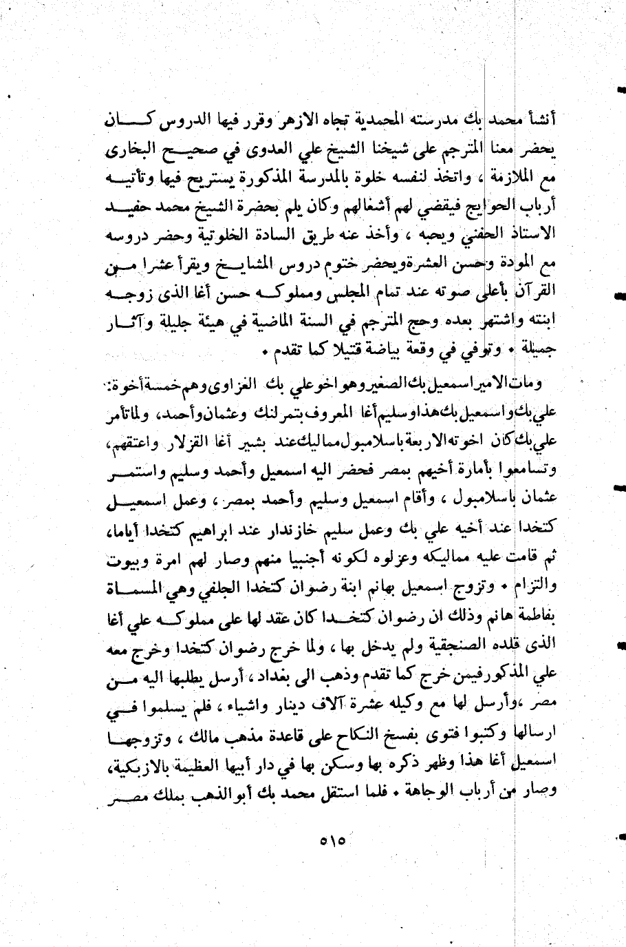 ومات الأمير إسمعيل بك الصغير وهو اخو علي بك الغزاوى وهم خمسة أخوة علي بك وإسمعيل بك هذا وسليم إنما المعروف بتمرلنك وعثمان وأحمد ولما تأمر علي بك كان اخوته الأربعة باسلامبول مماليك عند بشير أغا القزلار واعتقهم وتسامعوا بامارة أخيهم بمصر فحضر إليه إسمعيل وأحمد وسليم واستمر عثمان باسلامبول وأقام إسمعيل وسليم وأحمد بمصر وعمل إسمعيل كتخدا عند أخيه علي بك وعمل سليم خازندار عند إبراهيم كتخدا أياما ثم قامت عليه مماليكه وعزلوه لكونه أجنبيا منهم وصار لهم امرة وبيوت والتزام. وتزوج إسمعيل بهانم ابنة رضوان كتخدا الجلفي وهي المسماة بفاطمة هانم وذلك أن رضوان كتخدا كان عقد لها على مملوكه علي أغا الذي قلده الصنجقية ولم يدخل بها ولما خرج رضوان كتخدا وخرج معه علي المذكور فيمن خرج كما تقدم وذهب إلى بغداد أرسل يطلبها إليه من مصر وأرسل لها مع وكيله عشرة آلاف دينار واشياء فلم يسلموا في ارسالها وكتبوا فتوى بفسخ النكاح على قاعدة مذهب مالك وتزوجها إسمعيل أغا هذا وظهر ذكره بها وسكن بها في دار أبيها العظيمة بالازبكية وصار من أرباب الوجاهة. فلما استقل محمد بك أبو الذهب بملك مصر