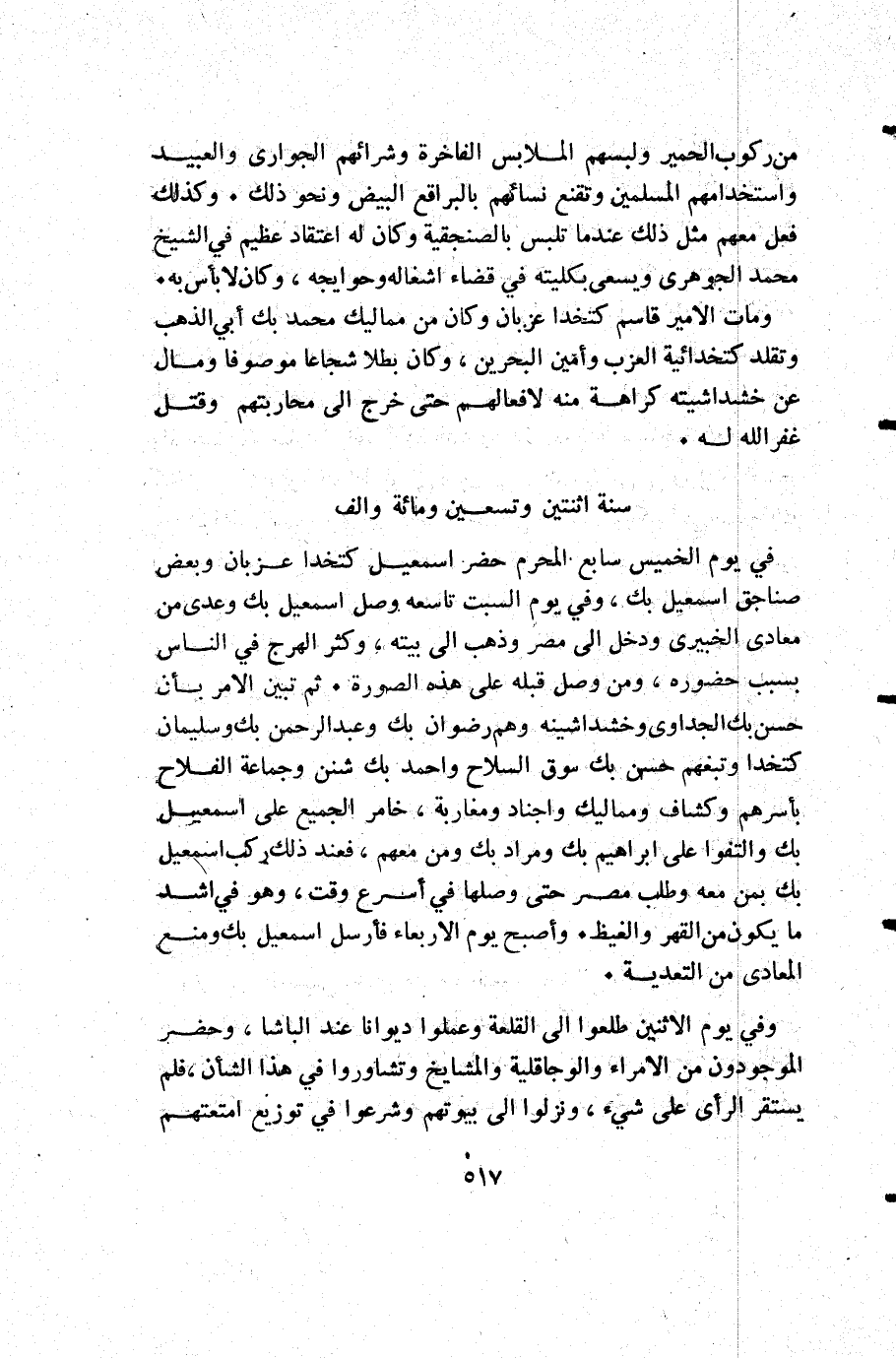 من ركوب الحمير ولبسهم الملابس الفاخرة وشرائهم الجوارى والعبيد واستخدامهم المسلمين وتقنع نسائهم بالبراقع البيض ونحو ذلك. وكذلك فعل معهم مثل ذلك عندما تلبس بالصنجقية وكان له اعتقاد عظيم في الشيخ محمد الجوهرى ويسعى بكليته في قضاء اشغاله وحوايجه وكان لا بأس به. ومات الأمير قاسم كتخدا عزبان وكان من مماليك محمد بك أبي الذهب وتقلد كتخدائية العزب وأمين البحرين وكان بطلا شجاعا موصوفا ومال عن خشداشيته كراهة منه لأفعالهم حتى خرج إلى محاربتهم وقتل غفر الله له.
