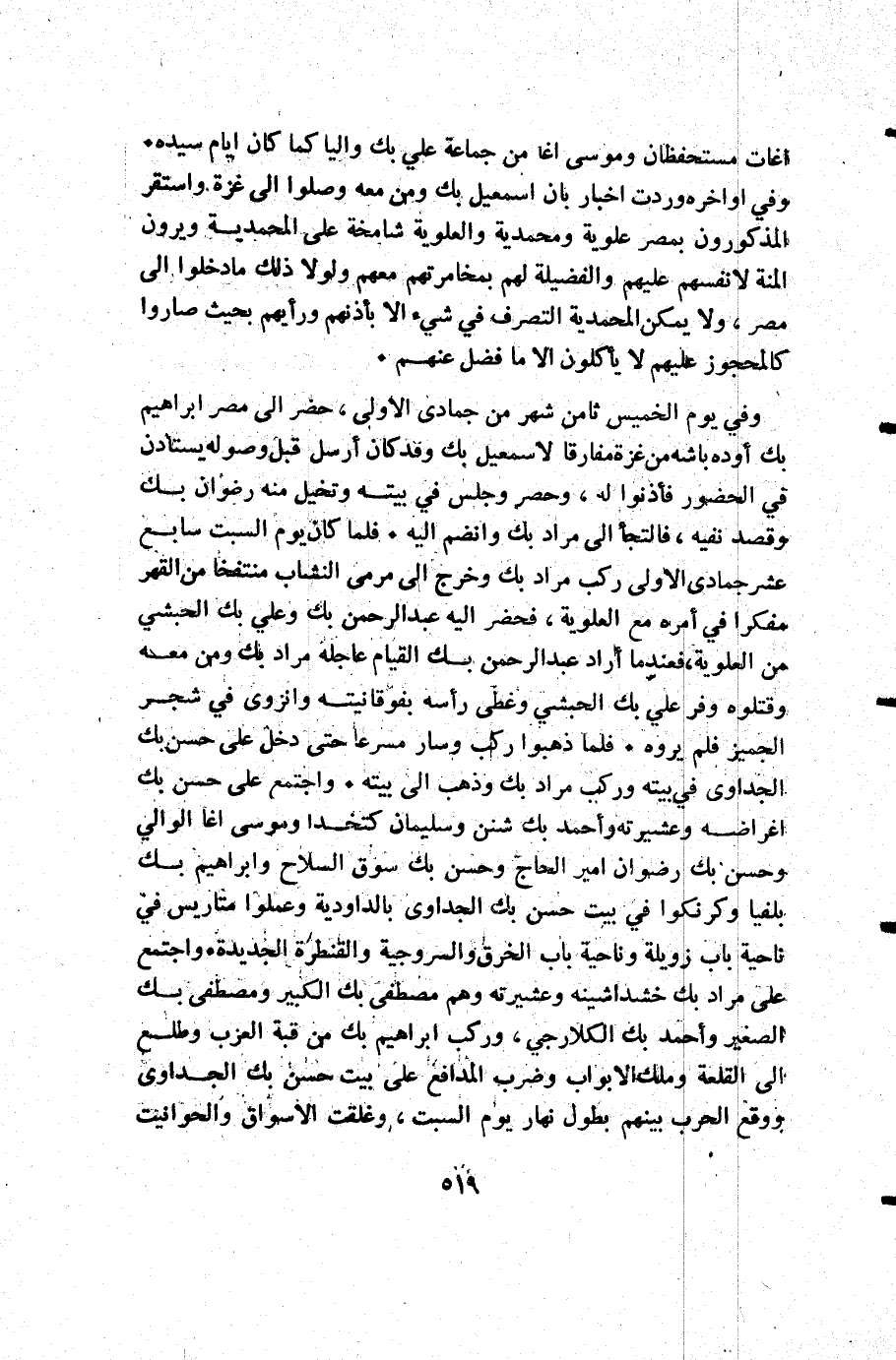 أغات مستحفظان وموسى اغا من جماعة علي بك واليا كما كان أيام سيده. وفي أواخره وردت اخبار بأن إسمعيل بك ومن معه وصلوا إلى غزة واستقر المذكورون بمصر علوية ومحمدية والعلوية شامخة على المحمدية ويرون المنة لانفسهم عليهم والفضيلة لهم بمخامرتهم معهم ولولا ذلك ما دخلوا إلى مصر ولا يمكن المحمدية التصرف في شيء إلا بأذنهم ورأيهم بحيث صاروا كالمحجوز عليهم لا يأكلون إلا ما فضل عنهم.