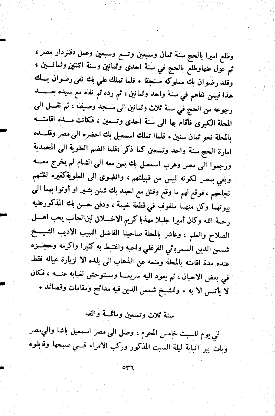 في يوم السبت خامس المحرم وصل إلى مصر إسمعيل باشا والي مصر وبات ببر انبابة ليلة السبت المذكور وركب الأمراء في صبحها وقابلوه.
