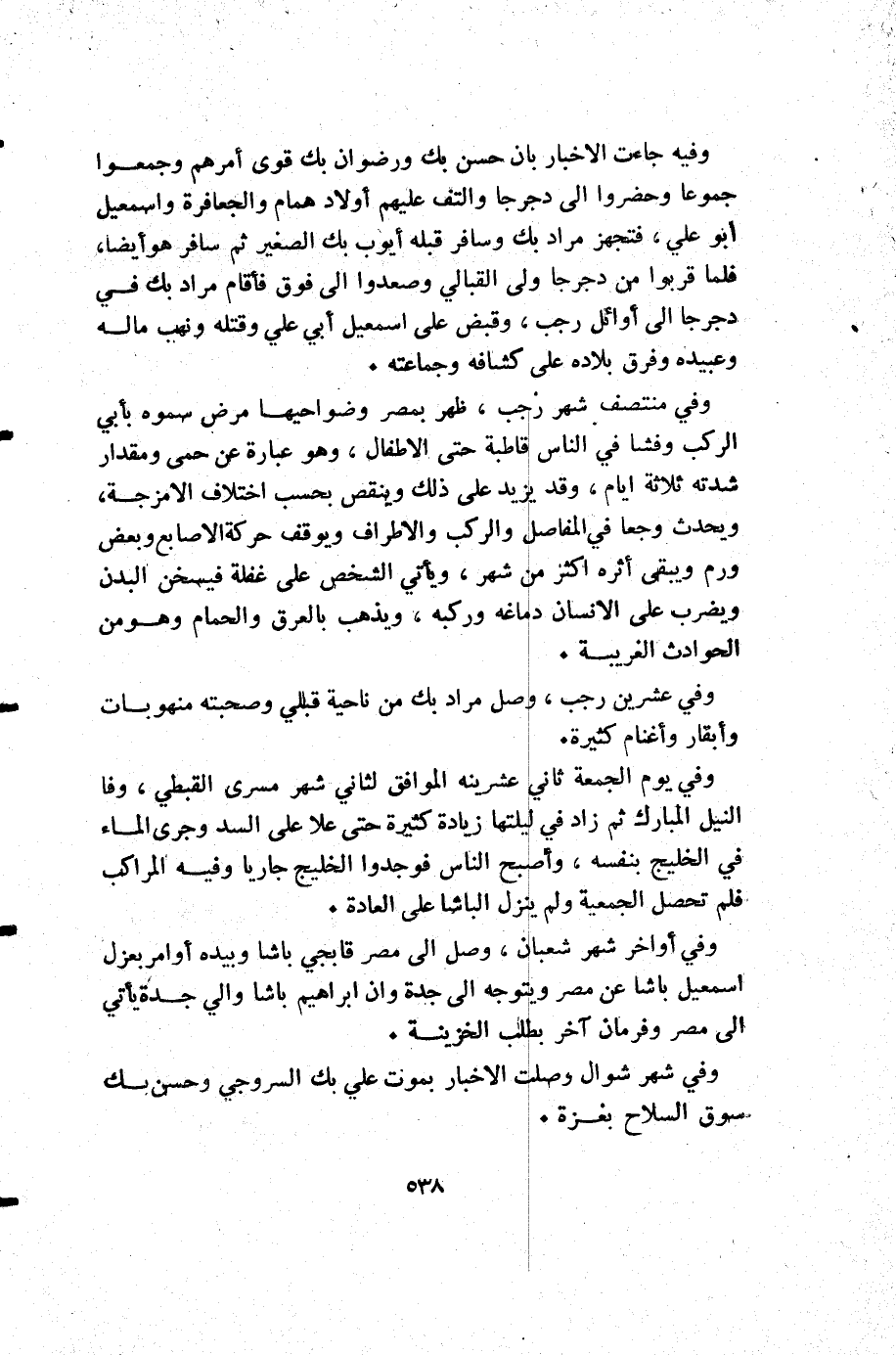 وفي عشرين رجب وصل مراد بك من ناحية قبلي وصحبته منهوبات وأبقار وأغنام كثيرة.