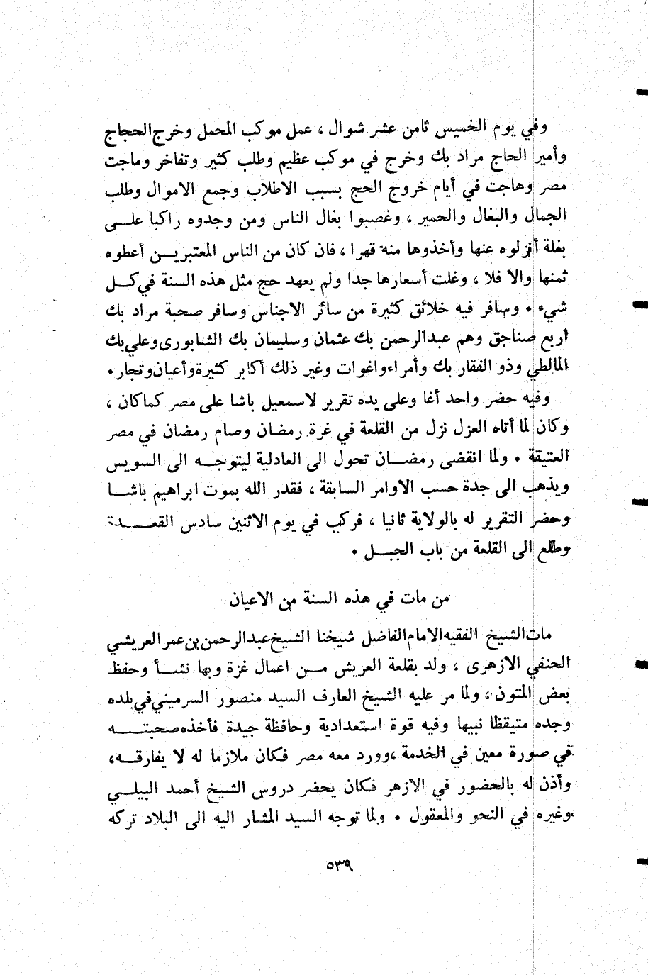 وفي يوم الخميس ثامن عشر شوال عمل موكب المحمل وخرج الحجاج وأمير الحاج مراد بك وخرج في موكب عظيم وطلب كثير وتفاخر وماجت مصر وهاجت في أيام خروج الحج بسبب الاطلاب وجمع الأموال وطلب الجمال والبغال والحمير وغصبوا بغال الناس ومن وجدوه راكبا على بغلة أنزلوه عنها وأخذوها منه قهرا فإن كان من الناس المعتبرين أعطوه ثمنها وإلا فلا وغلت أسعارها جدا ولم يعهد حج مثل هذه السنة في كل شيء. وسافر فيه خلائق كثيرة من سائر الأجناس وسافر صحبة مراد بك أربع صناجق وهم عبد الرحمن بك عثمان وسليمان بك الشابورى وعلي بك المالطي وذو الفقار بك وأمراء واغوات وغير ذلك أكابر كثيرة وأعيان وتجار. وفيه حضر واحد أغا وعلى يده تقرير لإسمعيل باشا على مصر كما كان وكان لما أتاه العزل نزل من القلعة في غرة رمضان وصام رمضان في مصر العتيقة. ولما انقضى رمضان تحول إلى العادلية ليتوجه إلى السويس ويذهب إلى جدة حسب الأوامر السابقة فقدر الله بموت إبراهيم باشا وحضر التقرير له بالولاية ثانيا فركب في يوم الإثنين سادس القعدة وطلع إلى القلعة من باب الجبل.
