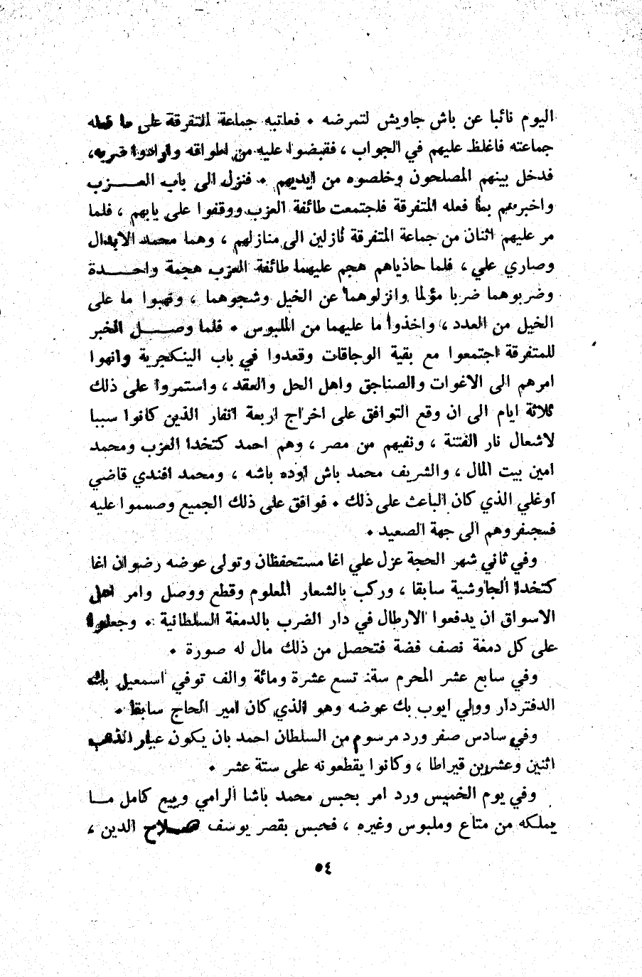 اليوم نائبا عن باش جاويش لتمرضه. فعاتبه جماعة التفرقة على ما فعله جماعته فاغلظ عليهم في الجواب فقبضوا عليه من اطواقه وأرادوا ضربه فدخل بينهم المصلحون وخلصوه من أيديهم. فنزل إلى باب العزب وأخبرهم بما فعله المتفرقة فاجتمعت طائفة العزب ووقفوا على بابهم فلما مر عليهم اثنان من جماعة المتفرقة نازلين إلى منازلهم وهما محمد الأبدال وصاري علي فلما حاذياهم هجم عليهما طائفة العزب هجمة واحدة وضربوهما ضربا مؤلما وانزلوهما عن الخيل وشجوهما ونهبوا ما على الخيل من العدد وأخذوا ما عليهما من الملبوس. فلما وصل الخبر للمتفرقة اجتمعوا مع بقية الوجاقات وقعدوا في باب الينكجرية وانهوا أمرهم إلى الأغوات والصناجق وأهل الحل والعقد واستمروا على ذلك ثلاثة أيام إلى أن وقع التوافق على اخراج أربعة انفار الذين كانوا سببا لاشعال نار الفتنة ونفيهم من مصر وهم أحمد كتخدا العزب ومحمد أمين بيت المال والشريف محمد باش اوده باشه ومحمد افندي قاضي اوغلي الذي كان الباعث على ذلك. فوافق على ذلك الجميع وصمموا عليه فسفروهم إلى جهة الصعيد.