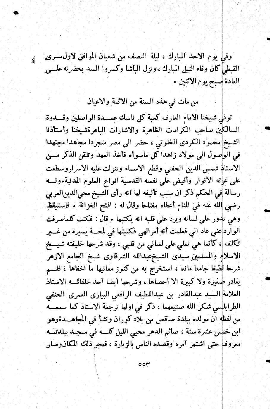 توفي شيخنا الإمام العارف كعبة كل ناسك عمدة الواصلين وقدوة السالكين صاحب الكرامات الظاهرة والاشارات الباهرة شيخنا وأستاذننا الشيخ محمود الكردي الخلوتي حضر إلى مصر متجردا مجاهدا مجتهدا في الوصول إلى مولاه زاهدا كل ما سوأه فأخذ العهد وتلقن الذكر من الأستاذ شمس الدين الحفني وقطع الأسماء وتنزلت عليه الأسرار وسطعت على غرته الأنوار وأفيض على نفسه القدسية أنواع العلوم المدنية. وله رسالة في الحكم ذكر أن سبب تأليفه لها أنه رأى الشيخ محي الدين العربي رضي الله عنه في المنام أعطاه مفتاحا وقال له: افتح الخزانة. فاستيقظ وهي تدور على لسانه ويرد على قلبه أنه يكتبها. قال: فكنت كلما صرفت الوارد عني عاد الي فعلمت أنه أمر الهي فكتبتها في لمحة يسيرة من غير تكلف كأنما هي تملي على لساني من قلبي وقد شرحها خليفته شيخ الإسلام والمسلمين سيدي الشيخ عبد الله الشرقاوي شيخ الجامع الأزهر شرحا لطيفا جامعا مانعا استخرج به من كنوز معانيها ما اخفاها فلم يغادر صغيرة ولا كبيرة إلا أحصاها وشرحها أيضا أحد خلفائه الأستاذ العلامة السيد عبد القادر بن عبد اللطيف الرافعي البيارى العمرى الحنفي الطرابلسي شكر الله صنيعهما ذكر في أولها ترجمة الأستاذ كما سمعه من لفظه أن مولده ببلدة صاقص من بلاد كوران ونشأ في المجاهدة وهو ابن خمسة عشرة سنة صائم الدهر محيي الليل كله في مسجد ببلدته معروف حتى اشتهر أمره وقصده الناس بالزيارة فهجر ذلك المكان وصار.