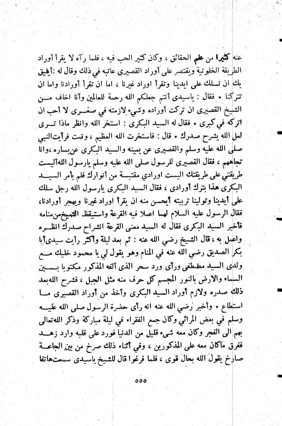 عنه كثيرا من علم الحقائق وكان كثير الحب فيه فلما رآه لا يقرأ أوراد الطريقة الخلوتية ويقتصر على أوراد القصيرى عاتبه في ذلك وقال له أيليق بك: أن تسلك على ايدينا وتقرأ أوراد غيرنا إما أن تقرأ أورادنا وأما أن تتركنا. فقال: يا سيدي أنتم جعلكم الله رحمة للعالمين وأنا اخاف من الشيخ القصيرى أن تركت أوراده وشيء لازمته في صغرى لا أحب أن اتركه في كبرى. فقال له السيد البكرى: استخر الله وانظر ماذا ترى لعل الله يشرح صدرك. قال: فاستخرت الله العظيم ونمت فرأيت النبي صلى الله عليه وسلم والقصيرى عن يمينه والسيد البكرى عن يساره وأنا تجاههم فقال القصيرى للرسول صلى الله عليه وسلم: يا رسول الله أليست طريقتي على طريقتك اليست اورادي مقتبسة من أنوارك فلم يأمر السيد البكرى هذا بترك أورادى فقال السيد البكرى يا رسول الله رجل سلك على أيدينا وتولينا تربيته أيحسن منه أن يقرأ أوراد غيرنا ويهجر أورادنا فقال الرسول عليه السلام لهما: "اعملا فيه القرعة" واستيقظ الشيخ من منامه فأخبر السيد البكرى فقال له السيد معنى القرعة: انشراح صدرك انظره واعمل به قال الشيخ رضي الله عنه: ثم بعد ليلة وأكثر رأيت سيدى أبا بكر الصديق رضي الله عنه في المنام وهو يقول لي يا محمود خليك مع ولدى السيد مصطفى ورأى ورد سحر الذى ألفه المذكور مكتوبا بين السماء والأرض بالنور المجسم كل حرف منه مثل الجبل فشرح الله بعد ذلك صدره ولازم أوراد السيد البكرى وأخذ من أوراد القصيرى ما استطاع. وأخبر رضي الله عنه أنه رأى حضرة الرسول صلى الله عليه وسلم في بعض المرائي وكان جمع الفقراء في ليلة مباركة وذكر الله تعالى بهم إلى الفجر وكان معه شىء قليل من الدنيا فورد على قلبه وأراد زهد ففرق ما كان معه على المذكورين وفي أثناء ذلك صرخ من بين الجاعة صارخ يقول الله بحال قوى فلما فرغوا قال للشيخ: يا سيدى سمعت هاتفا.