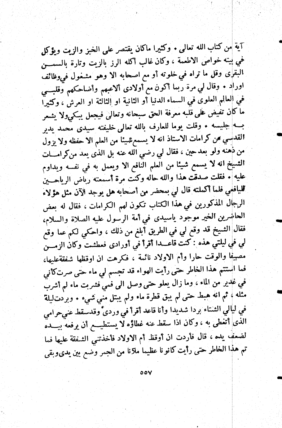 آية من كتاب الله تعالى. وكثيرا ما كان يقتصر على الخبز والزيت ويؤكل في بيته خواص الأطعمة وكان غالب أكله الرز بالزيت وتارة بالسمن البقرى وقل ما تراه في خلوته أو مع أصحابه إلا وهو مشغول في وظائف أوراد. وقال لي: مرة ربما أكون مع أولادى ألاعبهم وأضاحكهم وقلبي في العالم العلوى في السماء الدنيا أو الثانية أو الثالثة أو العرش وكثيرا ما كان تفيض على قلبه معرفة الحق سبحانه وتع إلى فيجعل يبكي ولا يشعر به جليسه. وقلت يوما للعارف بالله تعالى خليفته سيدى محمد بدير القدسي من كرامات الأستاذ أنه لا يسمع شيئا من العلم إلا حفظه ولا يزول من ذهنه ولو بعد حين فقال لي رضي الله عنه: بل الذي يعد من كرامات الشيخ أنه لا يسمع شيئا من العلم النافع إلا ويعمل به في نفسه ويداوم عليه. فقلت صدقت هذا والله حاله وكنت مرة أسمعته رياض الرياحين لليافعي فلما أكملته قال لي: بمحضر من أصحابه هل يوجد الآن مثل هؤلاء الرجال المذكورين في هذا الكتاب تكون لهم الكرامات فقال له بعض الحاضرين: الخير موجود يا سيدى في أمة الرسول عليه الصلاة والسلام فقال الشيخ: قد وقع لي في الطريق أبلغ من ذلك واحكي لكم عما وقع لي في ليلتي هذه كنت قاعدا أقرأ في أورادي فعطشت وكان الزمن مصيفا والوقت حارا وأم الأولاد نائمة فكرهت أن اوقظها شفقة عليها فما استتم هذا الخاطر حتى رأيت الهواء قد تجسم لي ماء حتى صرت كأني في غدير من الماء وما زال يعلو حتى وصل إلى فمي فشربت ماء لم أشرب مثله ثم أنه هبط حتى لم يبق قطرة ماء ولم يبتل مني شيء. وبردت ليلة في ليالي الشتاء بردا شديدا وأنا قاعد أقرأ في وردى وقد سقط عني حرامي الذي أتغطى به وكان إذا سقط عنه غطاؤه لا يستطيع أن يرفعه بيده لضعف يده قال: فأردت أن أوقظ أم الأولاد فأخذتني الشفقة عليها فما تم هذا الخاطر حتى رأيت كانونا عظيما ملآنا من الجمر وضع بين يدى وبقى.