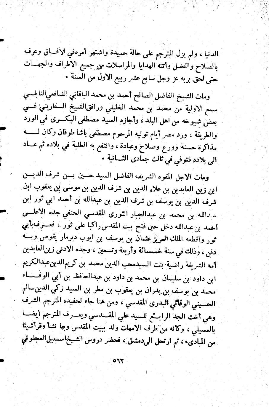 ومات الشيخ الفاضل الصالح أحمد بن محمد الباقاني الشافعي النابلسي سمع الأولية من محمد بن محمد الخليلي ورافق الشيخ السفاريني في بعض شيوخه من أهل البلد وأجازه السيد مصطفى البكرى في الورد والطريقة ورد مصر أيام تولية المرحوم مصطفى باشا طوقان وكان له مذاكرة حسنة وورع وصلاح وعبادة وانتفع به الطلبة في بلاده ثم عاد إلى بلاده فتوفي في ثالث جمادى الثانية.