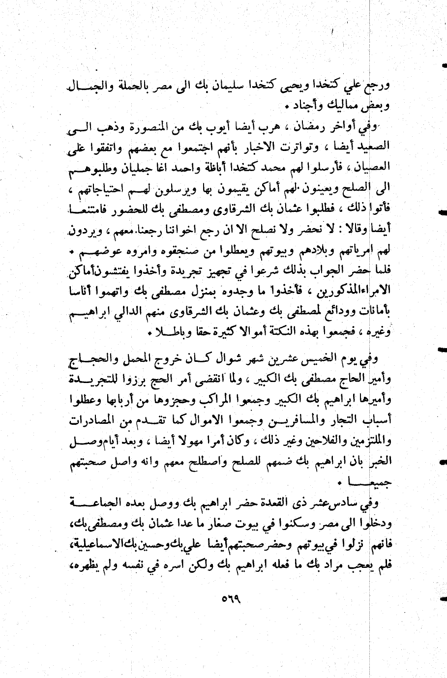 وفي سادس عشر ذى القعدة حضر إبراهيم بك ووصل بعده الجماعة ودخلوا إلى مصر وسكنوا في بيوت صغار ما عدا عثمان بك ومصطفى بك فإنهم نزلوا في بيوتهم وحضر صحبتهم أيضا علي بك وحسين بك الأسماعيلية فلم يعجب مراد بك ما فعله إبراهيم بك ولكن اسره في نفسه ولم يظهره.