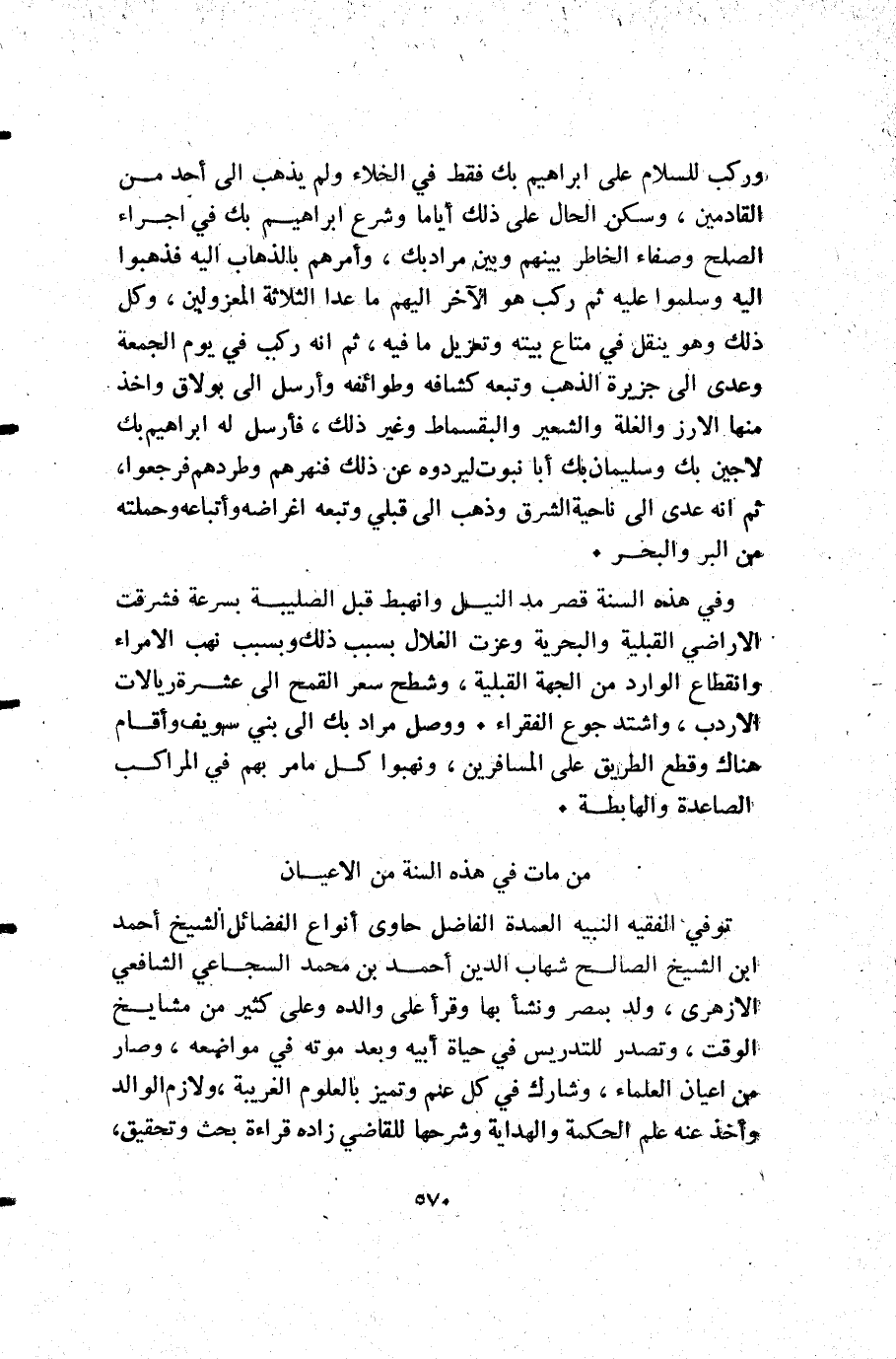 وركب للسلام على إبراهيم بك فقط في الخلاء ولم يذهب إلى أحد من القادمين وسكن الحال على ذلك أياما وشرع إبراهيم بك في اجراء الصلح وصفاء الخاطر بينهم وبين مراد بك وأمرهم بالذهاب إليه فذهبوا إليه وسلموا عليه ثم ركب هو الآخر إليهم ما عدا الثلاثة المعزولين وكل ذلك وهو ينقل في متاع بيته وتعزيل ما فيه ثم أنه ركب في يوم الجمعة وعدى إلى جزيرة الذهب وتبعه كشافه وطوائفه وأرسل إلى بولاق وأخذ منها الارز والغلة والشعير والبقسماط وغير ذلك فأرسل له إبراهيم بك لاجين بك وسليمان بك أبا نبوت ليردوه عن ذلك فنهرهم وطردهم فرجعوا ثم أنه عدى إلى ناحية الشرق وذهب إلى قبلي وتبعه اغراضه وأتباعه وحملته من البر والبحر.