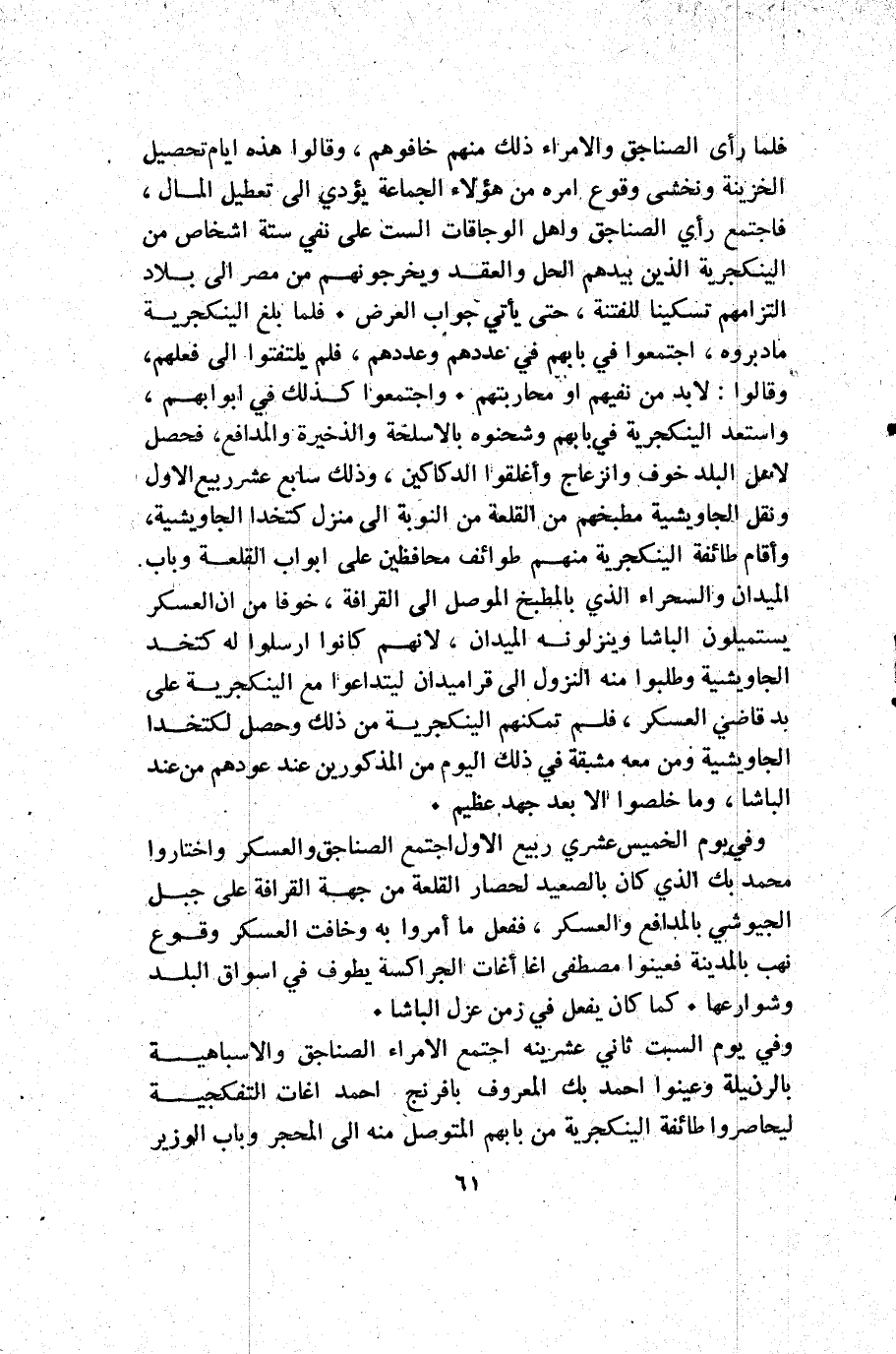 فلما رأى الصناجق والأمراء ذلك منهم خافوهم وقالوا هذه أيام تحصيل الخزينة ونخشى وقوع امره من هؤلاء الجماعة يؤدي إلى تعطيل المال فاجتمع رأي الصناجق وأهل الوجاقات الست على نفي ستة أشخاص من الينكجرية الذين بيدهم الحل والعقد ويخرجونهم من مصر إلى بلاد التزامهم تسكينا للفتنة حتى يأتي جواب العرض. فلما بلغ الينكجرية ما دبروه اجتمعوا في بابهم في عددهم وعددهم فلم يلتفتوا إلى فعلهم وقالوا لا بد من نفيهم أو محاربتهم. واجتمعوا كذلك في ابوابهم واستعد الينكجرية في بابهم وشحنوه بالاسلحة والذخيرة والمدافع فحصل لأهل البلد خوف وانزعاج وأغلقوا الدكاكين وذلك سابع عشر ربيع الأول ونقل الجاويشية مطبخهم من القلعة من النوبة إلى منزل كتخدا الجاويشية وأقام طائفة الينكجرية منهم طوائف محافظين على أبواب القلعة وباب الميدان والسحراء الذي بالمطبخ الموصل إلى القرافة خوفا من أن العسكر يستميلون الباشا وينزلونه الميدان لأنهم كانوا أرسلوا له كتخد الجاويشية وطلبوا منه النزول إلى قراميدان ليتداعوا مع الينكجرية على بد قاضي العسكر فلم تمكنهم الينكجرية من ذلك وحصل لكتخدا الجاويشية ومن معه مشبقة في ذلك اليوم من المذكورين عند عودهم من عند الباشا وما خلصوا إلا بعد جهد عظيم.