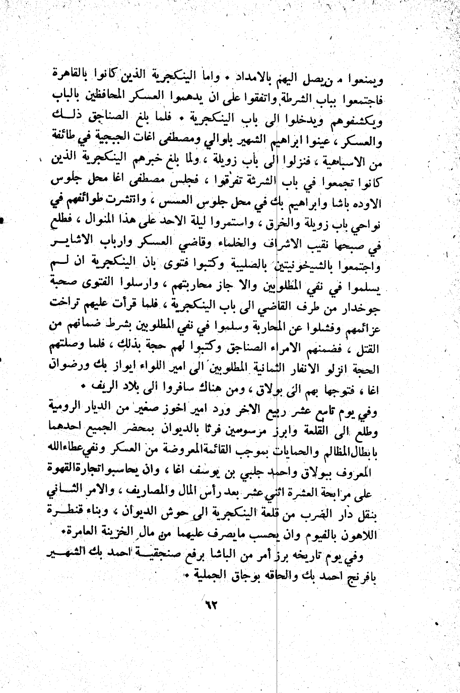 ويمنعوا من يصل إليهم بالامداد. واما الينكجرية الذين كانوا بالقاهرة فاجتمعوا بباب الشرطة واتفقوا على أن يدهموا العسكر المحافظين بالباب ويكشفوهم ويدخلوا إلى باب الينكجرية. فلما بلغ الصناجق ذلك والعسكر عينوا إبراهيم الشهير بالوالي ومصطفى اغات الجبجية في طائفة من الأسباهية فنزلوا إلى باب زويلة ولما بلغ خبرهم الينكجرية الذين كانوا تجمعوا في باب الشرشة تفرقوا فجلس مصطفى اغا محل جلوس الأوده باشا وإبراهيم بك في محل جلوس العسس وانتشرت طوائفهم في نواحي باب زويلة والخرق واستمروا ليلة الأحد على هذا المنوال فطلع في صبحها نقيب الأشراف والخلماء وقاضي العسكر وأرباب الأشاير واجتمعوا بالشيخونيتين بالصليبة وكتبوا فتوى بان الينكجرية أن لم يسلموا في نفي المطلوبين وإلا جاز محاربتهم وأرسلوا الفتوى صحبة جوخدار من طرف القاضي إلى باب الينكجرية فلما قرأت عليهم تراخت عزائمهم وفشلوا عن المحاربة وسلموا في نفي المطلوبين بشرط ضمانهم من القتل فضمنهم الأمراء الصناجق وكتبوا لهم حجة بذلك فلما وصلتهم الحجة انزلوا الانفار الثمانية المطلوبين إلى أمير اللواء ايواز بك ورضوان اغا فتوجها بهم إلى بولاق ومن هناك سافروا إلى بلاد الريف.