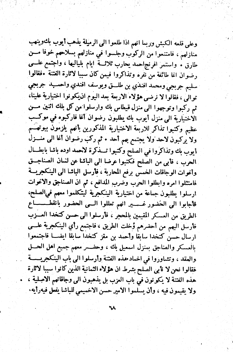وعلى قلعة الكبش وربما أنهم إذا طلعوا إلى الرميلة يذهب أيوب بك وينهب منازلهم فامتنعوا من الركوب وجلسوا في منازلهم بسلاحهم خوفا من طارق. واستمر افرنج أحمد يحارب ثلاثة أيام بلي إليها واجتمع على رضوان اغا طائفة من نفره وتذاكروا فيمن كان سببا لاثارة الفتنة. فقالوا سليم جربجي ومحمد افندي بن طلق ويوسف افندي وأحمد جربجي تو إلى فقالوا: لا نرضي هؤلاء الأربعة بعد اليوم أن يكونوا اختيارية علينا ثم ركبوا وتوجهوا إلى منزل قيطاس بك وأرسلوا من كل بلك اثنين من الاختيارية إلى منزل أيوب بك يطلبون رضوان أغا فاركبوه في موكب عظيم وكتبوا تذاكر للاربعة الاختيارية المذكورين بأنهم يلزمون بيوتهم ولا يركبون لاحد ولا يجتمع بهم أحد. ثم ركب رضوان أغا إلى منزل أيوب بك وتذاكروا في الصلح وكتبوا تذكرة لأحمد باشا بابطال الحرب فأبى من الصلح فكتبوا عرضا إلى الباشا عن لسان الصناجق وأغوات الوجاقات الخمس برفع المحاربة فأرسل الباشا إلى الينكجرية فامتثلوا امره وابطلوا الحرب وضرب المدافع ثم أن الصناجق والاغوات أرسلوا يطلبون جماعة من اختيارية الينكجرية ليتكلموا معهم في الصلح فأجابوا إلى الحضور غير أنهم تعللوا إلى الحضور بانقطاع الطريق من العسكر المقيمين بالمحجر فأرسلوا إلى حسن كتخدا العزب فأرسل إليهم من أحضرهم وخلت الطريق فاجتمع رأي الينكجرية على ارسال حسن كتخدا سابقا وأحمد بن مقز كتخدا سابقا أيضا فاجتمعوا بالعسكر والصناجق بمنزل إسمعيل بك وحضر معهم جميع أهل الحل والعقد وتشاوروا في اخماد هذه الفتنة وأرسلوا إلى باب الينكجرية فقالوا نحن لا نأبى الصلح بشرط أن هؤلاء الثمانية الذين كانوا سببا لاثارة هذه الفتنة لا يكونون في باب العزب بل يذهبون إلى وجاقاتهم الأصلية ولا يقيمون فيه وإن يسلموا الأمير حسن الاخميمي للباشا يفعل فيه رأيه.