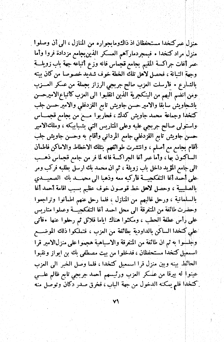منزل عمر كتخدا مستحفظان إذ ذاك وما بجواره من المنازل إلى أن وصلوا منزل مراد كتخدا. فبمجرد ما رآهم العسكر الذين بجامع مزدادة فروا وأما عمر أغات جراكسة المقيم بجامع قجماس فإنه وزع أتباعه جهة باب زويلة وجهة التبانة فحصل لأهل تلك الخطة خوف شديد خصوصا من كان بيته بالشارع. فأرسلت العزب صالح جربجي الرزاز بجملة من عسكر العزب ومن انضم إليهم من الينكجرية الذين انقلبوا إلى العزب كأتباع الأمير حسن باشجاويش سابقا والأمير حسن جاويش تابع القزدغلي والأمير حسن جلب كتخدا وجماعة محمد جاويش كدك فحاربوا مع من بجامع قجماس واستولى صالح جربجي عليه وعلى المتاريس التي بشبابيكه وملك الأمير حسن جاويش تابع القزدغلي جامع المرداني وأقام به وحسن جاويش جلب أقام بجامع مع أصلم وانتشرت طوائفهم بتلك الاخطاط والاماكن فاطمأن الساكنون بها وأما عمر أغا الجراكسة فإنه لما فر من جامع قجماس ذهب إلى جامع المؤيد داخل زويلة ثم أن محمد بك أرسل بطلبه فركب ومر على أحمد أغا التفكجية فأركبه معه وذهبا إلى محمد بك الصعيدي بالصليبية وحصل لأهل خط قوصون خوف عظيم بسبب إقامة أحمد أغا بالسلمانية ورحل غالبهم من المنازل فلما رحل عنهم اطمأنوا وتراجعوا وحضرت طائفة من المتفرقة إلى محل أحمد أغا التفكجية وعملوا متاريس على رأس عطفة الحطب ومكثوا هناك أياما قلائل ثم رحلوا عنها. فأتى علي كتخدا الساكن بالداودية بطائفة من العزب فتملكوا ذلك الموضع وجلسوا به ثم أن طائفة من المتفرقة والاسباهية هجموا على منزل الأمير قرا إسمعيل كتخدا مستحفظان فدخلوا من بيت مصطفى بك بن ايواز ونقبوا الحائط بينه وبين منزل قرا إسمعيل كتخدا فلما وصل الخبر إلى العزب عينوا له بيرقا من عسكر العزب ورئيسهم أحمد جربجي تابع ظالم علي كتخدا فلم يمكنه الدخول من جهة الباب فخرق صدر دكان وتوصل منه.