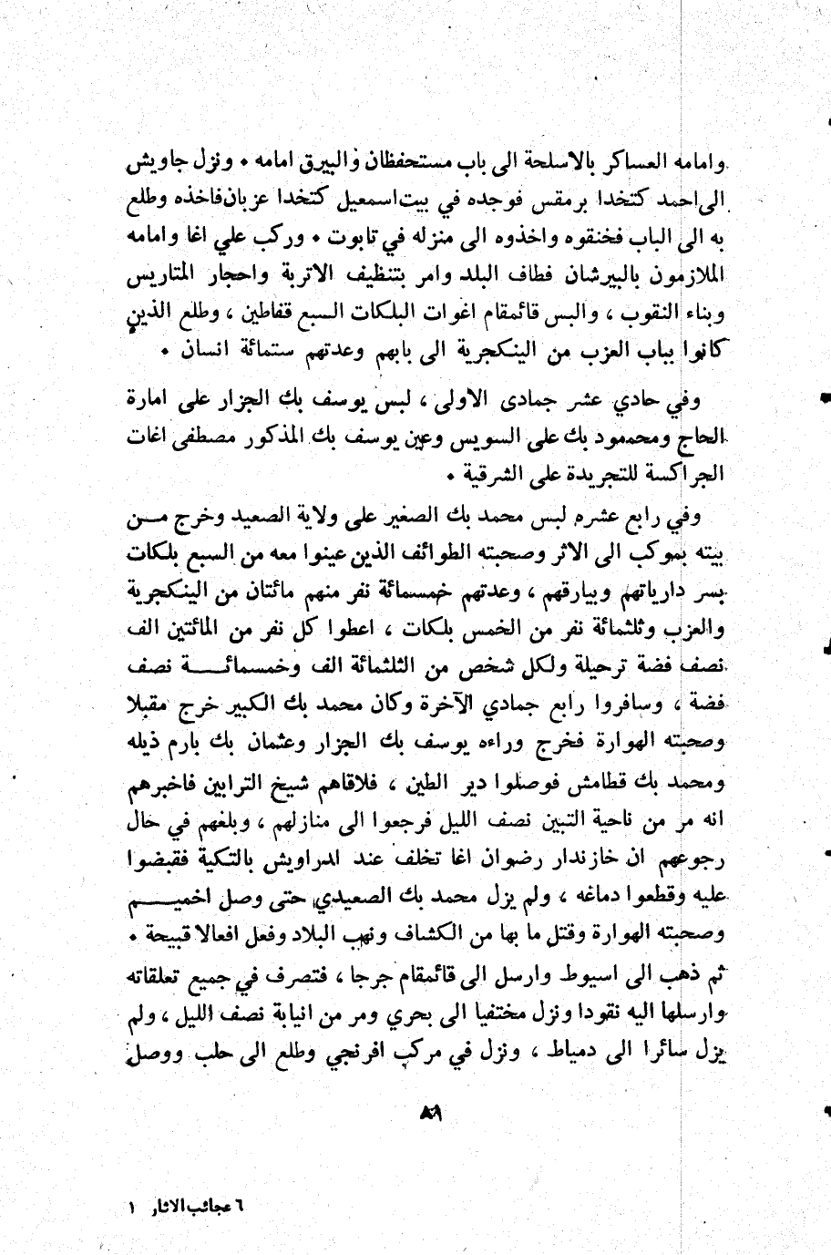 وإمامه العساكر بالاسلحة إلى باب مستحفظان والبيرق إمامه. ونزل جاويش إلى أحمد كتخدا برمقس فوجده في بيت إسمعيل كتخدا عزبان فأخذه وطلع به إلى الباب فخنقوه وأخذوه إلى منزله في تابوت. وركب علي اغا وإمامه الملازمون بالبيرشان فطاف البلد وأمر بتنظيف الاتربة واحجار المتاريس وبناء النقوب والبس قائمقام اغوات البلكات السبع قفاطين وطلع الذين كانوا بباب العزب من الينكجرية إلى بابهم وعدتهم ستمائة إنسان.