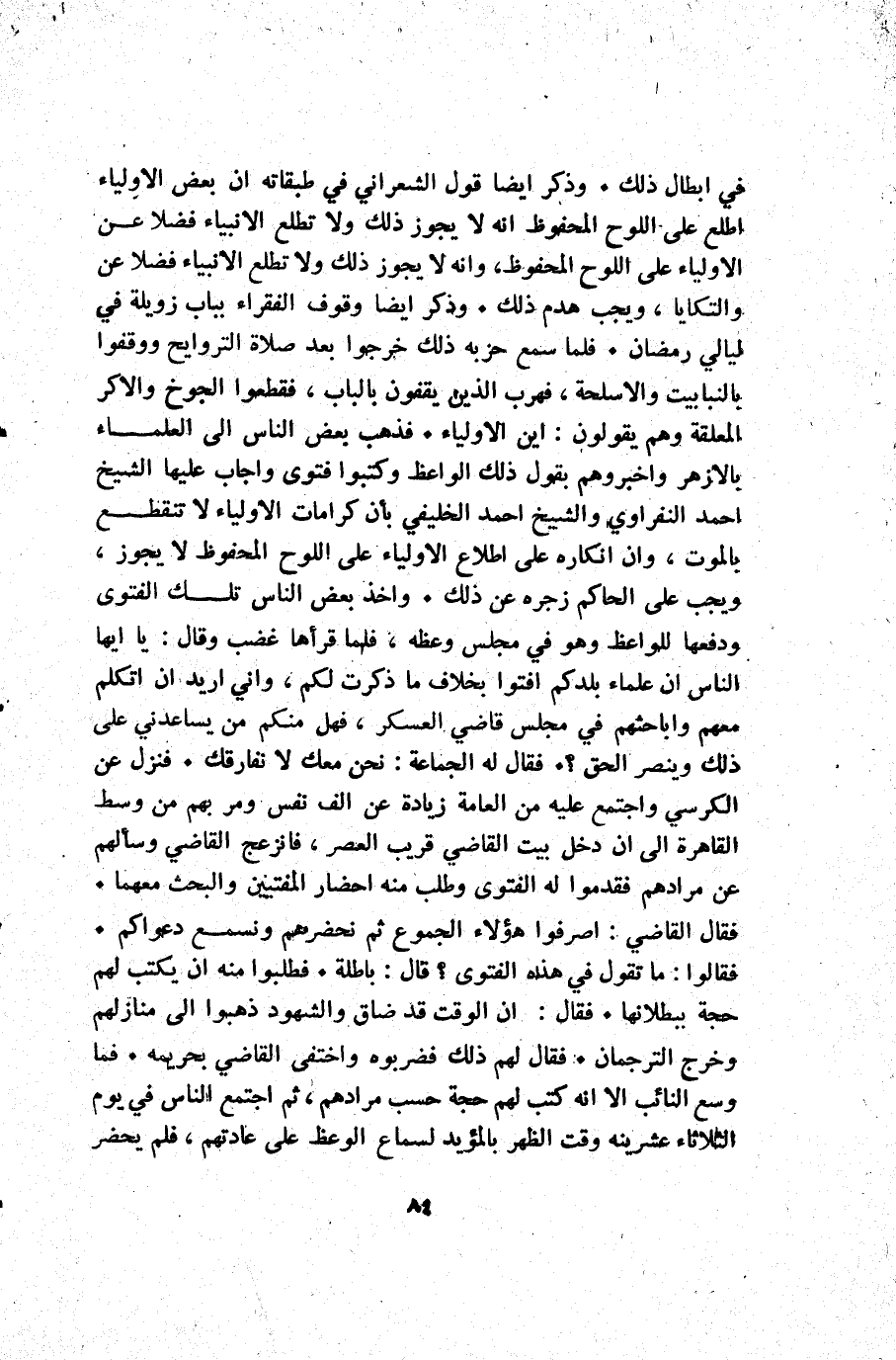 في ابطال ذلك. وذكر أيضا قول الشعراني في طبقاته أن بعض الأولياء اطلع على اللوح المحفوظ أنه لا يجوز ذلك ولا تطلع الانبياء فضلا عن الأولياء على اللوح المحفوظ وانه لا يجوز ذلك ولا تطلع الانبياء فضلا عن والتكايا ويجب هدم ذلك. وذكر أيضا وقوف الفقراء بباب زويلة في ليالي رمضان. فلما سمع حزبه ذلك خرجوا بعد صلاة التراويح ووقفوا بالنبابيت والاسلحة فهرب الذين يقفون بالباب فقطعوا الجوخ والاكر المعلقة وهم يقولون اين الأولياء: فذهب بعض الناس إلى العلماء بالأزهر واخبروهم بقول ذلك الواعظ وكتبوا فتوى واجاب عليها الشيخ أحمد النفراوي والشيخ أحمد الخليفي بأن كرامات الأولياء لا تنقطع بالموت وإن انكاره على اطلاع الأولياء على اللوح المحفوظ لا يجوز ويجب على الحاكم زجره عن ذلك. وأخذ بعض الناس تلك الفتوى ودفعها للواعظ وهو في مجلس وعظه فلما قرأها غضب وقال: يا ايها الناس إن علماء بلدكم أفتوا بخلاف ما ذكرت لكم وإني أريد أن أتكلم معهم وأباحثهم في مجلس قاضي العسكر فهل منكم من يساعدني على ذلك وينصر الحق. فقال له الجماعة: نحن معك لا نفارقك. فنزل عن الكرسي واجتمع عليه العامة زيادة عن ألف نفس ومر بهم من وسط القاهرة إلى أن دخل بيت القاضي قريب العصر فانزعج القاضي وسألهم عن مرادهم فقدموا له الفتوى وطلب منه أحضار المفتين والبحث معهما. فقال القاضي: اصرفوا هؤلاء الجموع ثم نحضرهم ونسمع دعواكم. فقالوا ما تقول في هذه الفتوى قال باطلة. فطلبوا منه أن يكتب لهم حجة ببطلانها. فقال أن الوقت قد ضاق والشهود ذهبوا إلى منازلهم وخرج الترجمان. فقال لهم: فضربوه واختفى القاضي بجريمة. فما وسع النائب إلا أنه كتب لهم حجة حسب مرادهم ثم اجتمع الناس في يوم الثلاثاء عشرينه وقت الظهر بالمؤيد لسماع الوعظ على عادتهم فلم يحضر