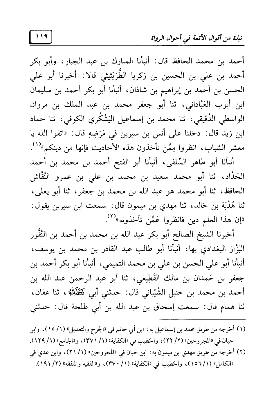 أحمد بن محمد الحافظ قال: أنبأنا المبارك بن عبد الجبار، وأبو بكر أحمد بن علي بن الحسين بن زكريا الطُّرَيْثيثي قالا: أخبرنا أبو علي الحسن بن أحمد بن إبراهيم بن شاذان، أنبأنا أبو بكر أحمد بن سليمان بن أيوب العَبَّاداني، ثنا أبو جعفر محمد بن عبد الملك بن مروان الواسطي الدَّقيقي، ثنا محمد بن إسماعيل اليَشْكُري الكوفي، ثنا حماد ابن زيد قال: دخلنا على أنس بن سيرين في مَرَضِهِ قال: "اتقوا الله يا معشر الشباب، انظروا مِمَّن تأخذون هذه الأحاديث فإنها من دينكم" (¬١).أنبأنا أبو طاهر السِّلفي، أنبأنا أبو الفتح أحمد بن محمد بن أحمد الحَدَّاد، ثنا أبو محمد سعيد بن محمد بن علي بن عمرو النَّقَّاش الحافظ، ثنا أبو محمد هو عبد الله بن محمد بن جعفر، ثنا أبو يعلى، ثنا هُدْبَة بن خالد، ثنا مهدي بن ميمون قال: سمعت ابن سيرين يقول: "إن هذا العلم دين فانظروا عَمَّن تأخذونه" (¬٢).