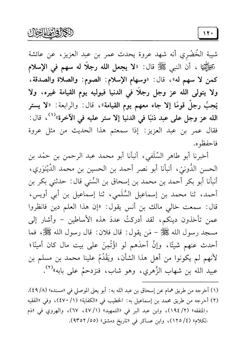 شيبة الخَضْرِي أنه شهد عروة يحدث عمر بن عبد العزيز، عن عائشة -رَضِيَ اللهُ عَنْهَا-، أن النبي -صَلَّى اللهُ عَلَيْهِ وَسَلَّمَ- قال: "لا يجعل الله رجلًا له سهم في الإسلام كمن لا سهم له"، قال: "وسهام الإسلام: الصوم: والصلاة والصدقة، ولا يتولى الله عز وجل رجلًا في الدنيا فيوليه يوم القيامة غيره، ولا يُحِبُّ رجلٌ قومًا إلا جاء معهم يوم القيامة"، قال: والرابعة: "لا يستر الله عز وجل على عبد ذنبًا في الدنيا إلا ستر عليه في الآخرة" (¬١)، قال: فقال عمر بن عبد العزيز: إذا سمعتم هذا الحديث من مثل عروة فاحفظوه.