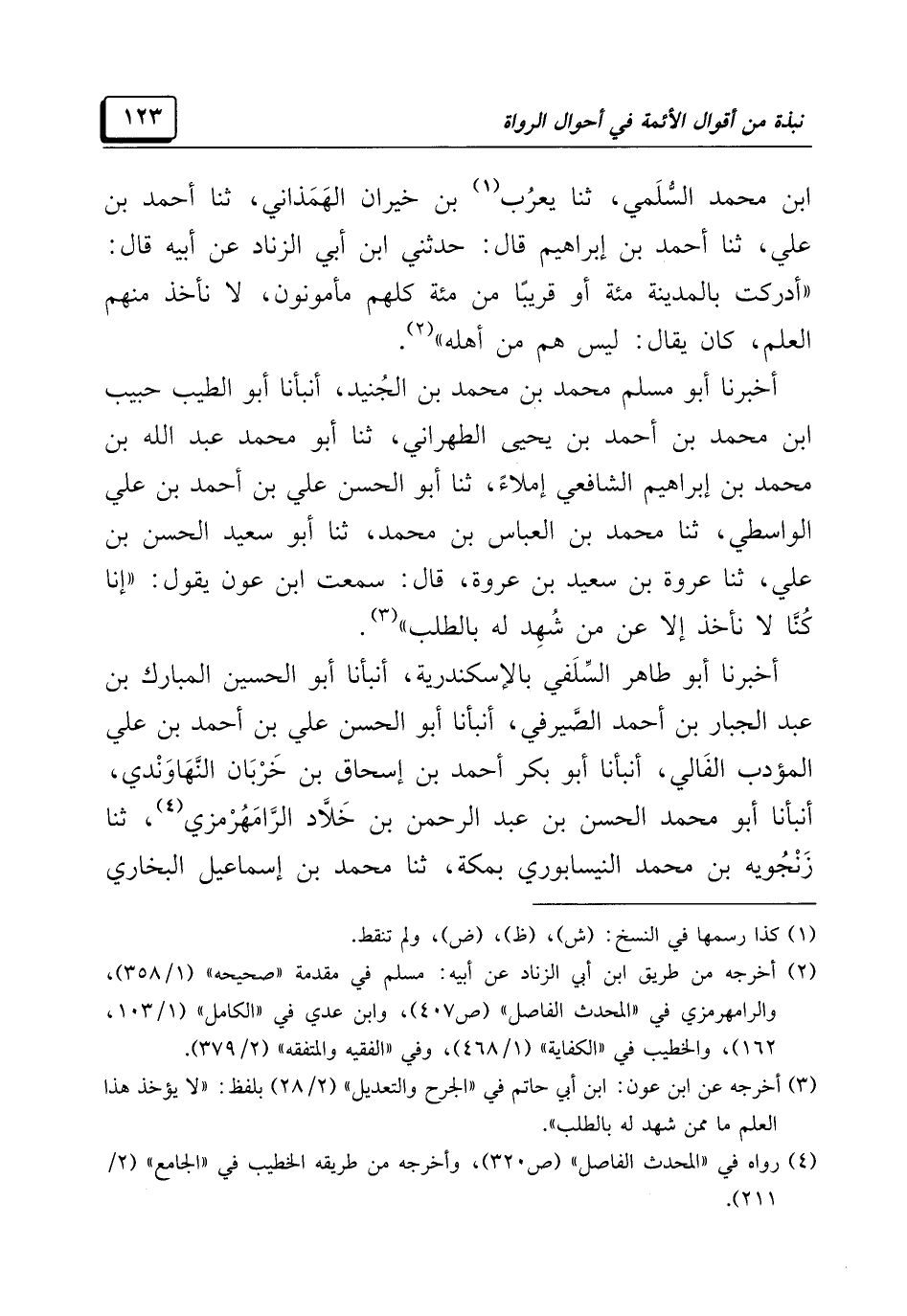 ابن محمد السُّلَمي، ثنا يعرُب (¬١) بن خيران الهَمَذاني، ثنا أحمد بن علي، ثنا أحمد بن إبراهيم قال: حدثني ابن أبي الزناد عن أبيه قال: "أدركت بالمدينة مئة أو قريبًا من مئة كلهم مأمونون، لا تأخذ منهم العلم، كان يقال: ليس هم من أهله" (¬٢).