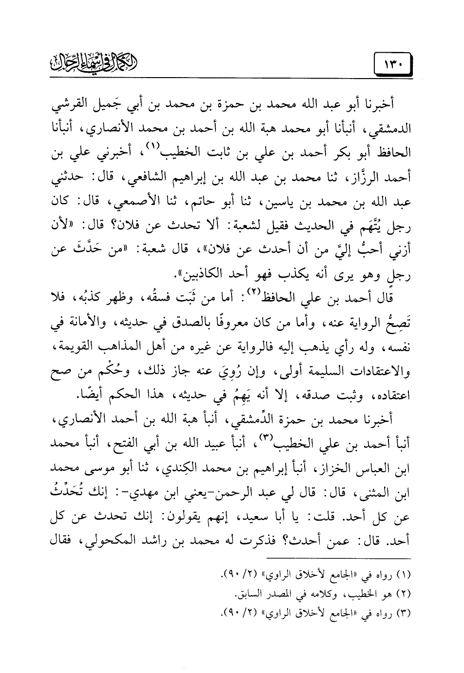 أخبرنا أبو عبد الله محمد بن حمزة بن محمد بن أبي جَميل القرشي الدمشقي، أنبأنا أبو محمد هبة الله بن أحمد بن محمد الأنصاري، أنبأنا الحافظ أبو بكر أحمد بن علي بن ثابت الخطيب (¬١)، أخبرني علي بن أحمد الرزَّاز، ثنا محمد بن عبد الله بن إبراهيم الشافعي، قال: حدثني عبد الله بن محمد بن ياسين، ثنا أبو حاتم، ثنا الأصمعي، قال: كان رجل يُتَّهَم في الحديث فقيل لشعبة: ألا تحدث عن فلان؟ قال: "لأن أزني أحبُّ إليَّ من أن أحدث عن فلان"، قال شعبة: "من حَدَّثَ عن رجلٍ وهو يرى أنه يكذب فهو أحد الكاذبين".