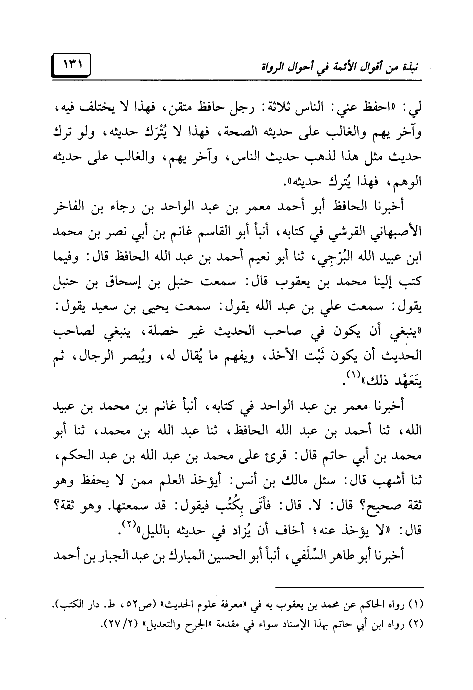 أخبرنا الحافظ أبو أحمد معمر بن عبد الواحد بن رجاء بن الفاخر الأصبهاني القرشي في كتابه، أنبأ أبو القاسم غانم بن أبي نصر بن محمد بن عبيد الله البُرْجِي، ثنا أبو نعيم أحمد بن عبد الله الحافظ قال: وفيما كتب إلينا محمد بن يعقوب قال: سمعت حنبل بن إسحاق بن حنبل يقول: سمعت علي بن عبد الله يقول: سمعت يحيى بن سعيد يقول: "ينبغي أن يكون في صاحب الحديث غير خصلة، ينبغي لصاحب الحديث أن يكون ثَبْت الأخذ، ويفهم ما يُقال له، ويُبصر الرجال، ثم يَتَعَهَّد ذلك" (¬١).
