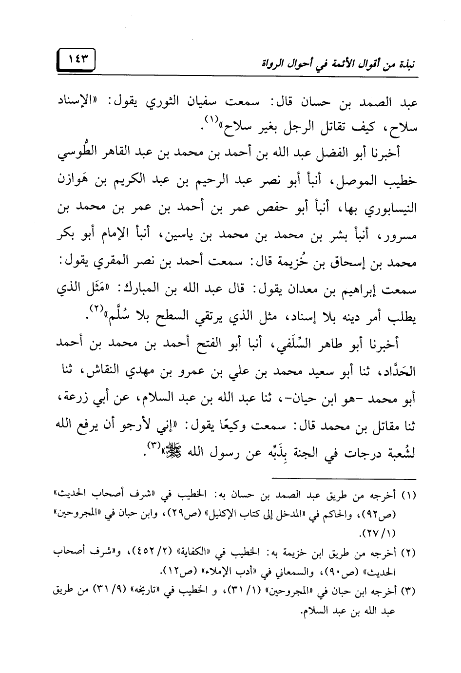 عبد الصمد بن حسان قال: سمعت سفيان الثوري يقول: "الإسناد سلاح، كيف تقاتل الرجل بغير سلاح" (¬١).