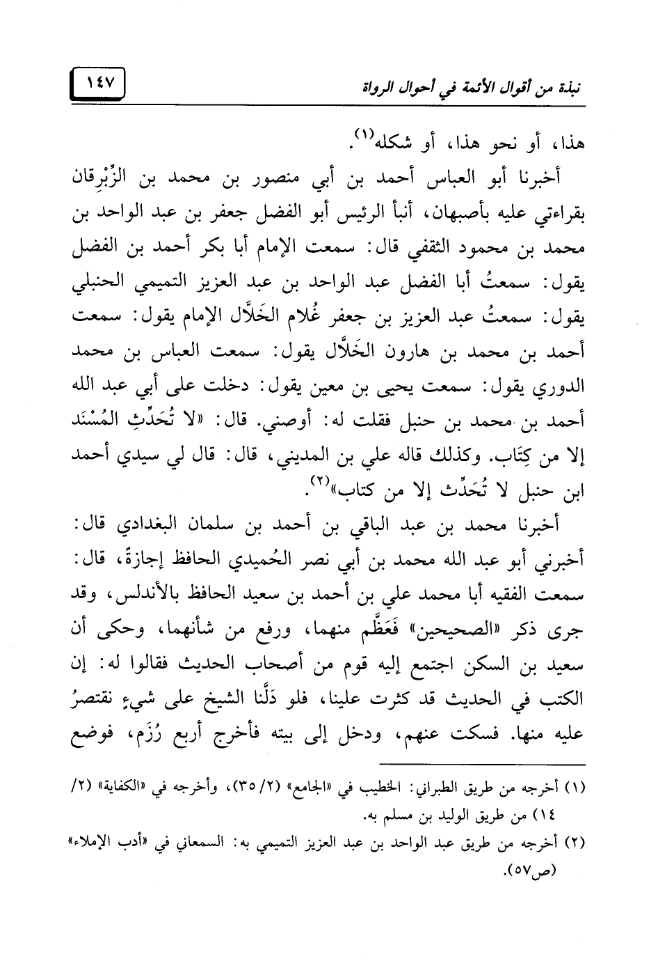 أخبرنا أبو العباس أحمد بن أبي منصور بن محمد بن الزِّبْرِقان بقراءتي عليه بأصبهان، أنبأ الرئيس أبو الفضل جعفر بن عبد الواحد بن محمد بن محمود الثقفي قال: سمعت الإمام أبا بكر أحمد بن الفضل يقول: سمعتُ أبا الفضل عبد الواحد بن عبد العزيز التميمي الحنبلي يقول: سمعتُ عبد العزيز بن جعفر غُلام الخَلَّال الإمام يقول: سمعت أحمد بن محمد بن هارون الخَلَّال يقول: سمعت العباس بن محمد الدوري يقول: سمعت يحيى بن معين يقول: دخلت على أبي عبد الله أحمد بن محمد بن حنبل فقلت له: أوصني. قال: "لا تُحَدِّثِ المُسْنَد إلا من كِتَاب. وكذلك قاله علي بن المديني، قال: قال لي سيدي أحمد بن حنبل لا تُحَدِّث إلا من كتاب" (¬٢).