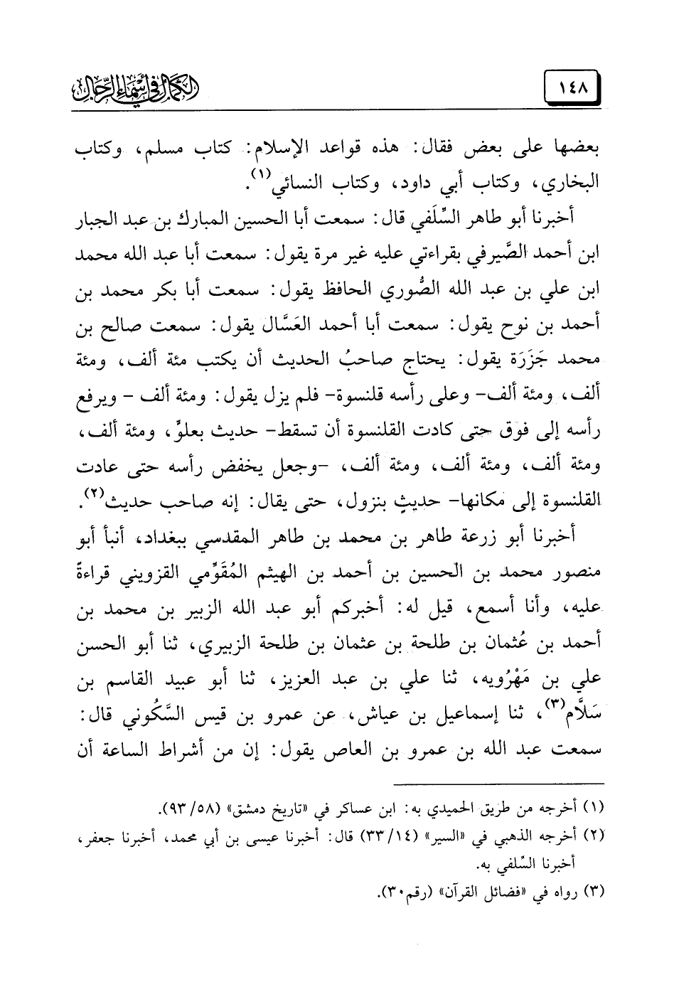أخبرنا أبو زرعة طاهر بن محمد بن طاهر المقدسي ببغداد، أنبأ أبو منصور محمد بن الحسين بن أحمد بن الهيثم المُقَوِّمي القزويني قراءةً عليه، وأنا أسمع، قيل له: أخبركم أبو عبد الله الزبير بن محمد بن أحمد بن عُثمان بن طلحة بن عثمان بن طلحة الزبيري، ثنا أبو الحسن علي بن مَهْرُويه، ثنا علي بن عبد العزيز، ثنا أبو عبيد القاسم بن سَلَّام (¬٣)، ثنا إسماعيل بن عياش، عن عمرو بن قيس السَّكُوني قال: سمعت عبد الله بن عمرو بن العاص يقول: إن من أشراط الساعة أن