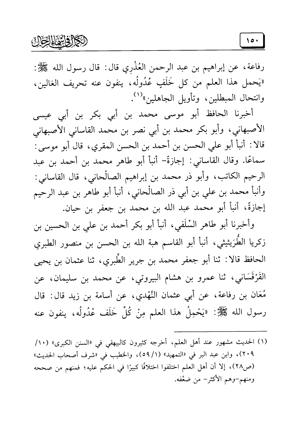 رفاعة، عن إبراهيم بن عبد الرحمن العُذْرِي قال: قال رسول الله -صَلَّى اللهُ عَلَيْهِ وَسَلَّمَ-: "يَحمل هذا العلم من كل خَلَفٍ عُدُولُه، ينفون عنه تحريف الغالين، وانتحال المبطلين، وتأويل الجاهلين" (¬١).