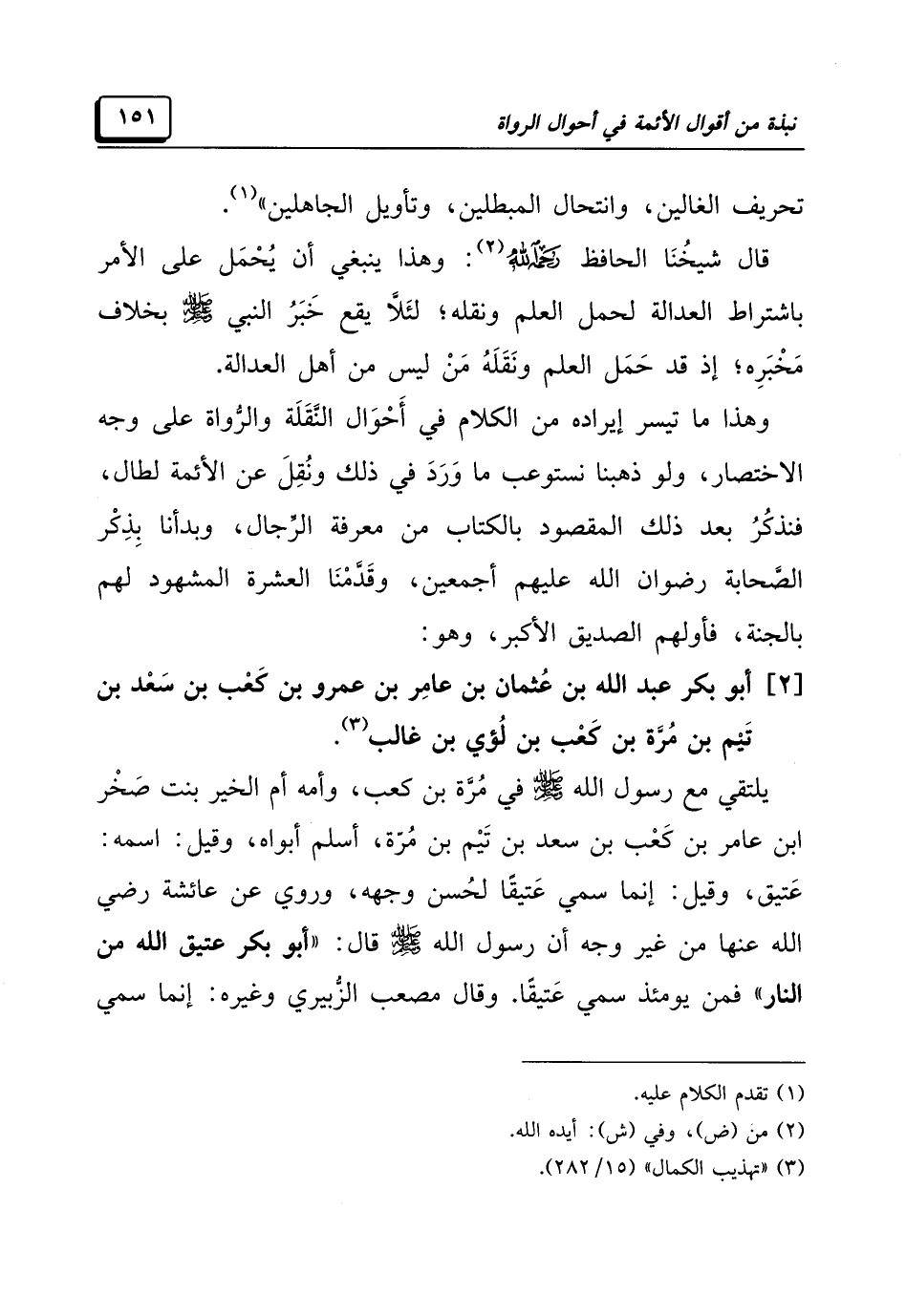 وهذا ما تيسر إيراده من الكلام في أَحْوَال النَّقَلَة والرُّواة على وجه الاختصار، ولو ذهبنا نستوعب ما وَرَدَ في ذلك ونُقِلَ عن الأئمة لطال، فنذكُرُ بعد ذلك المقصود بالكتاب من معرفة الرِّجال، وبدأنا بِذِكْر الصَّحابة رضوان الله عليهم أجمعين، وقَدَّمْنَا العشرة المشهود لهم بالجنة، فأولهم الصديق الأكبر، وهو: