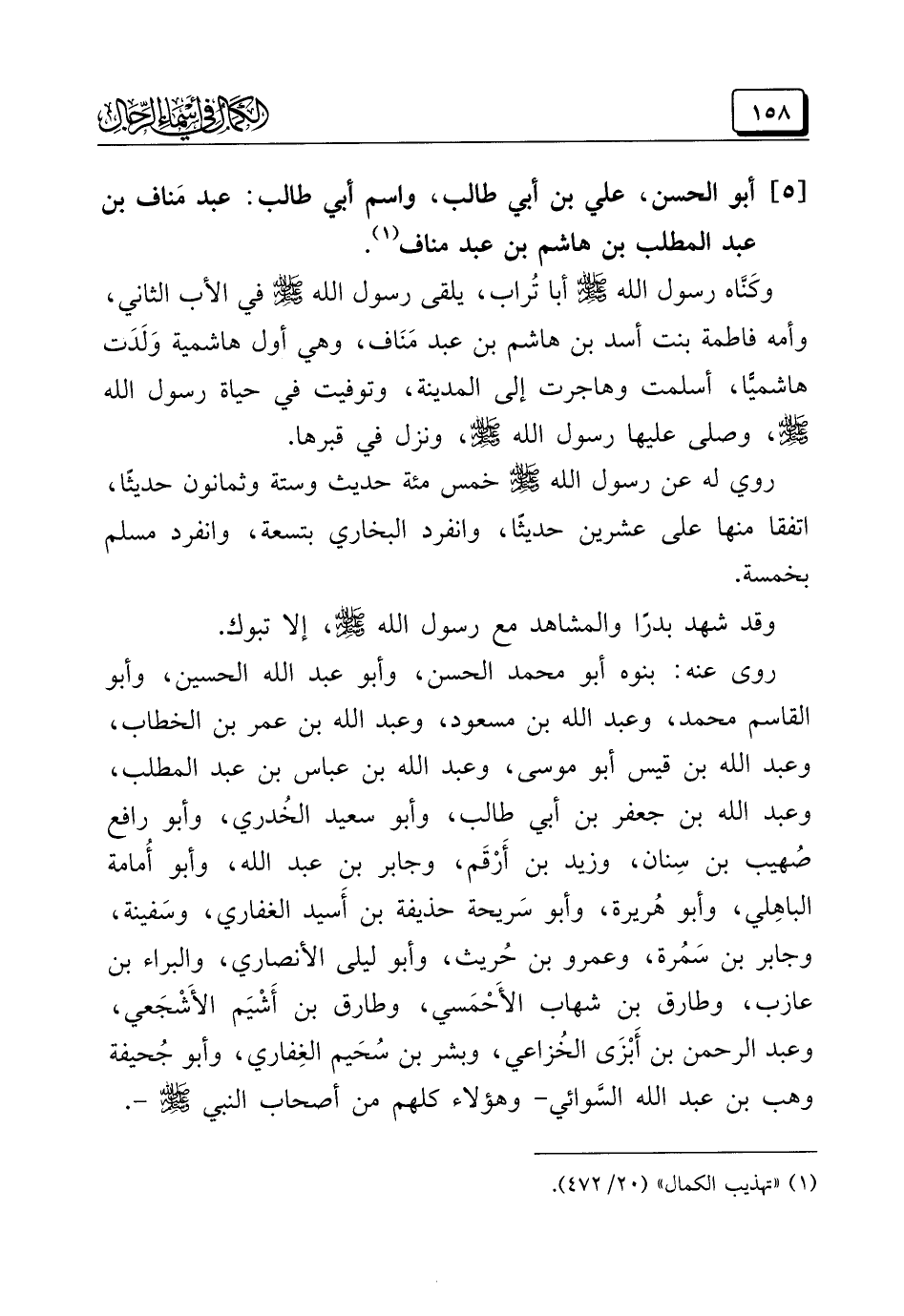 [٥] أبو الحسن، علي بن أبي طالب، واسم أبي طالب: عبد مَناف بن عبد المطلب بن هاشم بن عبد مناف (¬١).