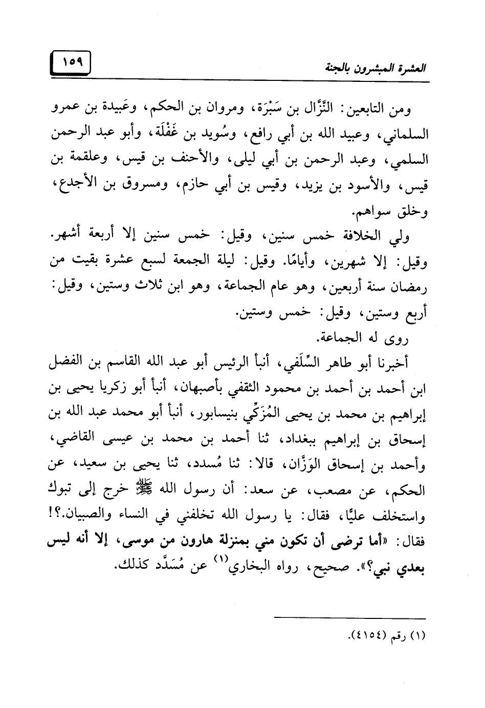 أخبرنا أبو طاهر السِّلَفي، أنبأ الرئيس أبو عبد الله القاسم بن الفضل بن أحمد بن أحمد بن محمود الثقفي بأصبهان، أنبأ أبو زكريا يحيى بن إبراهيم بن محمد بن يحيى المُزَكِّي بنيسابور، أنبأ أبو محمد عبد الله بن إسحاق بن إبراهيم ببغداد، ثنا أحمد بن محمد بن عيسى القاضي، وأحمد بن إسحاق الوَزَّان، قالا: ثنا مُسدد، ثنا يحيى بن سعيد، عن الحكم، عن مصعب، عن سعد: أن رسول الله -صَلَّى اللهُ عَلَيْهِ وَسَلَّمَ- خرج إلى تبوك واستخلف عليًّا، فقال: يا رسول الله تخلفني في النساء والصبيان.؟ ! فقال: "أما ترضى أن تكون مني بمنزلة هارون من موسى، إلا أنه ليس بعدي نبي؟ ". صحيح، رواه البخاري (¬١) عن مُسَدَّد كذلك.