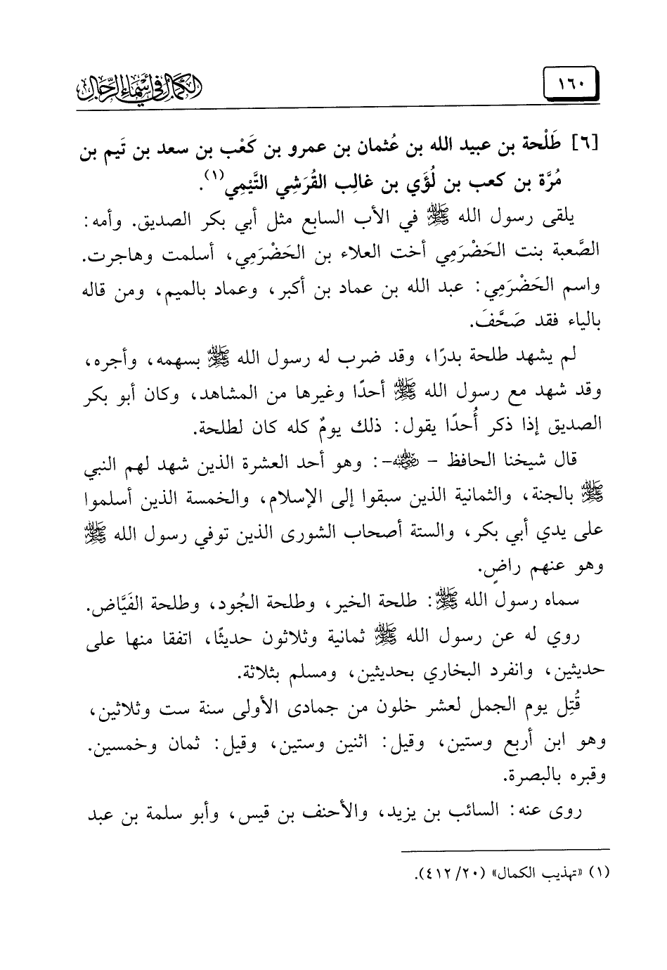 [٦] طَلْحة بن عبيد الله بن عُثمان بن عمرو بن كَعْب بن سعد بن تَيم بن مُرَّة بن كعب بن لُؤَي بن غالِب القُرَشِي التَّيْمِي (¬١).