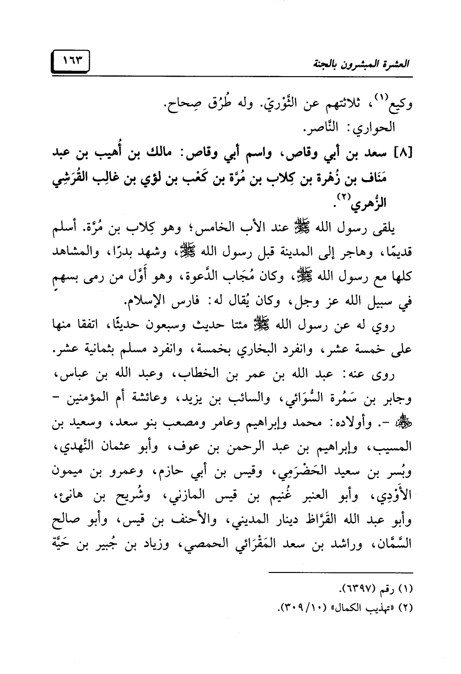 [٨] سعد بن أبي وقاص، واسم أبي وقاص: مالك بن أُهيب بن عبد مَنَاف بن زُهْرة بن كِلاب بن مُرَّة بن كَعْب بن لؤي بن غالِب القُرَشِي الزُّهري (¬٢).