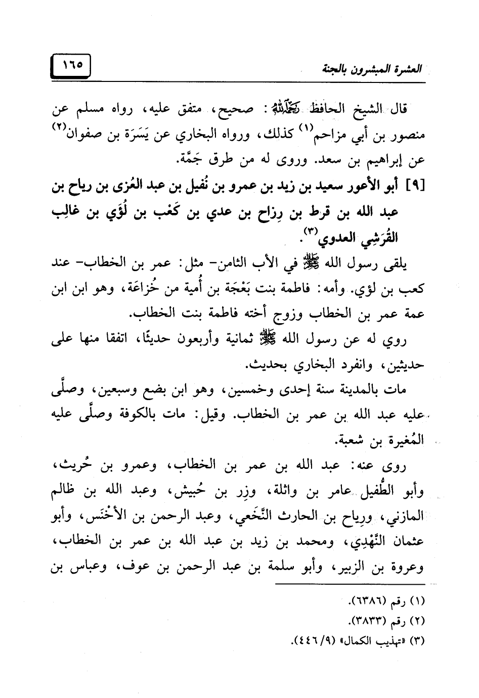 [٩] أبو الأعور سعيد بن زيد بن عمرو بن نُفيل بن عبد العُزي بن رباح بن عبد الله بن قرط بن رِزاح بن عدي بن كَعْب بن لُؤَي بن غالِب القُرَشِي العدوي (¬٣).