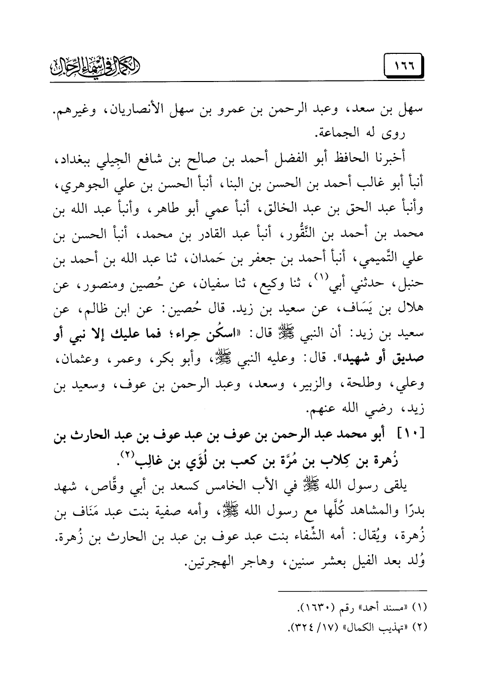أخبرنا الحافظ أبو الفضل أحمد بن صالح بن شافع الجِيلي ببغداد، أنبأ أبو غالب أحمد بن الحسن بن البنا، أنبأ الحسن بن علي الجوهري، وأنبأ عبد الحق بن عبد الخالق، أنبأ عمي أبو طاهر، وأنبأ عبد الله بن محمد بن أحمد بن النَّقُّور، أنبأ عبد القادر بن محمد، أنبأ الحسن بن على التَّميمي، أنبأ أحمد بن جعفر بن حَمدان، ثنا عبد الله بن أحمد بن حنبل، حدثني أبي (¬١)، ثنا وكيع، ثنا سفيان، عن حُصين ومنصور، عن هلال بن يَسَاف، عن سعيد بن زيد. قال حُصين: عن ابن ظالم، عن سعيد بن زيد: أن النبي -صَلَّى اللهُ عَلَيْهِ وَسَلَّمَ- قال: "أسكُن حِراء؛ فما عليك إلا نبي أو صديق أو شهيد". قال: وعليه النبي -صَلَّى اللهُ عَلَيْهِ وَسَلَّمَ-، وأبو بكر، وعمر، وعثمان، وعلي، وطلحة، والزبير، وسعد، وعبد الرحمن بن عوف، وسعيد بن زيد، رضي الله عنهم.