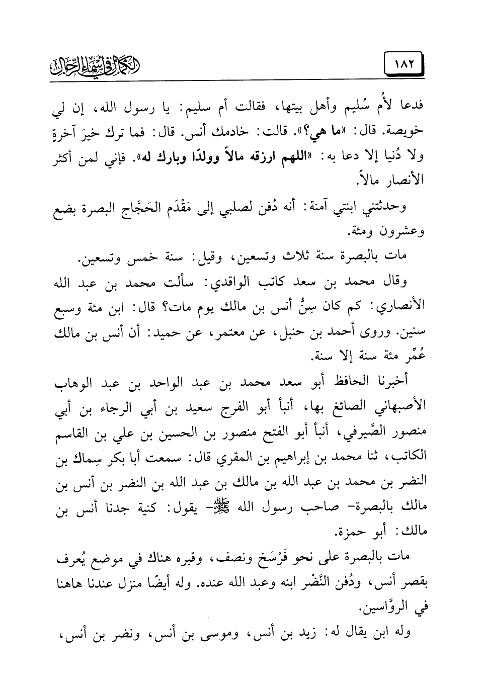 أخبرنا الحافظ أبو سعد محمد بن عبد الواحد بن عبد الوهاب الأصبهاني الصائغ بها، أنبأ أبو الفرج سعيد بن أبي الرجاء بن أبي منصور الصَّيرفي، أنبأ أبو الفتح منصور بن الحسين بن علي بن القاسم الكاتب، ثنا محمد بن إبراهيم بن المقري قال: سمعت أبا بكر سماك بن النضر بن محمد بن عبد الله بن مالك بن عبد الله بن النضر بن أنس بن مالك بالبصرة -صاحب رسول الله -صَلَّى اللهُ عَلَيْهِ وَسَلَّمَ-- يقول: كنية جدنا أنس بن مالك: أبو حمزة.