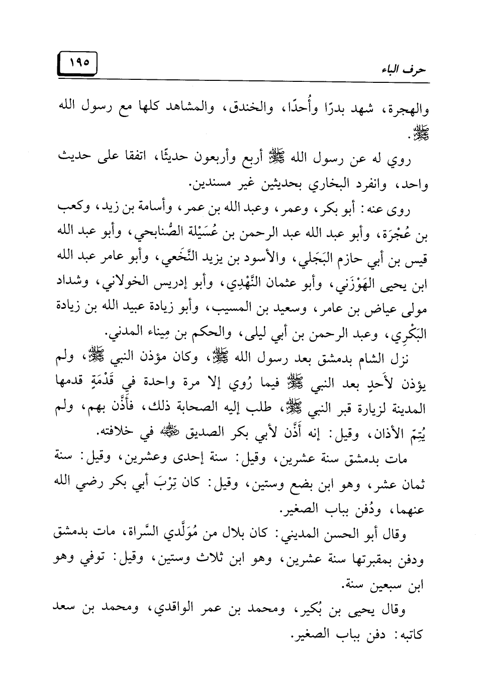 نزل الشام بدمشق بعد رسول الله -صَلَّى اللهُ عَلَيْهِ وَسَلَّمَ-، وكان مؤذن النبي -صَلَّى اللهُ عَلَيْهِ وَسَلَّمَ-، ولم يؤذن لأَحدٍ بعد النبي -صَلَّى اللهُ عَلَيْهِ وَسَلَّمَ- فيما رُوي إلا مرة واحدة في قَدْمَةٍ قدمها المدينة لزيارة قبر النبي -صَلَّى اللهُ عَلَيْهِ وَسَلَّمَ-، طلب إليه الصحابة ذلك، فأَذَّن بهم، ولم يُتِمّ الأذان، وقيل: إنه أَذَّن لأبي بكر الصديق -رَضِيَ اللهُ عَنْهُ- في خلافته.