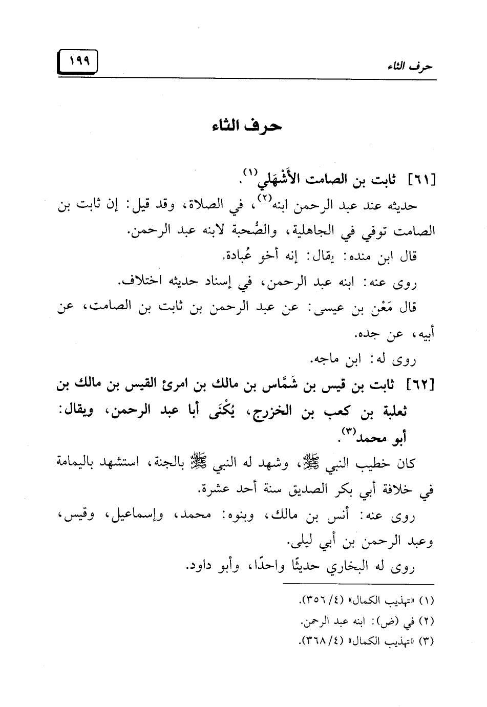 حديثه عند عبد الرحمن ابنه (¬٢)، في الصلاة، وقد قيل: إن ثابت بن الصامت توفي في الجاهلية، والصُّحبة لابنه عبد الرحمن.
