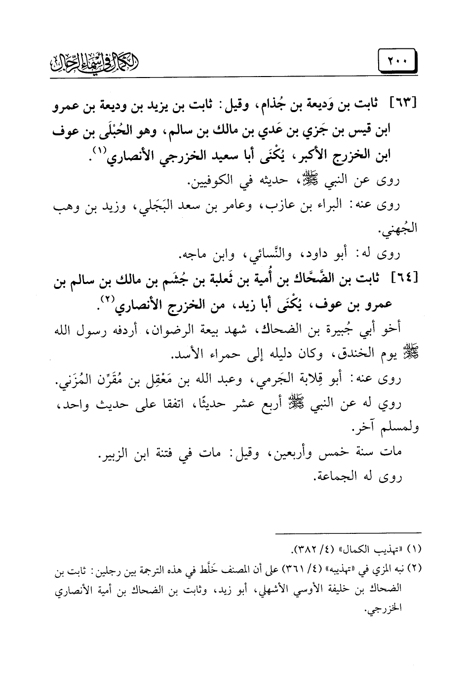 (¬٢) نبه المزي في "تهذيبه" (٤/ ٣٦١) على أن المصنف خَلَّط في هذه الترجمة بين رجلين: ثابت بن الضحاك بن خليفة الأوسي الأشهلي، أبو زيد، وثابت بن الضحاك بن أمية الأنصاري الخزرجي.