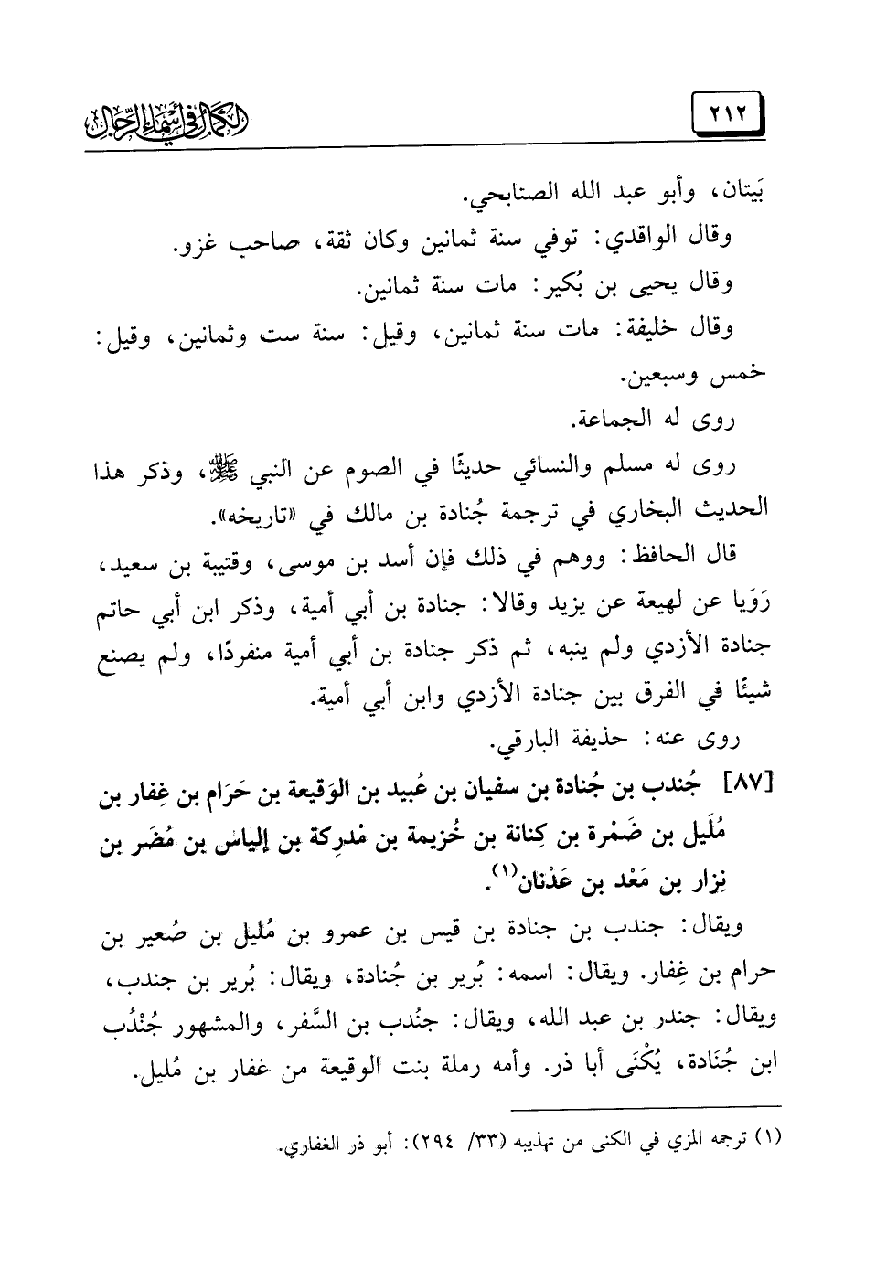 [٨٧] جُندب بن جُنادة بن سفيان بن عُبيد بن الوَقيعة بن حَرَام بن غِفار بن مُلَيل بن ضَمرة بن كِنانة بن خُزيمة بن مدرِكة بن إلياس بن مُضَر بن نِزار بن مَعد بن عَدنان (¬١).