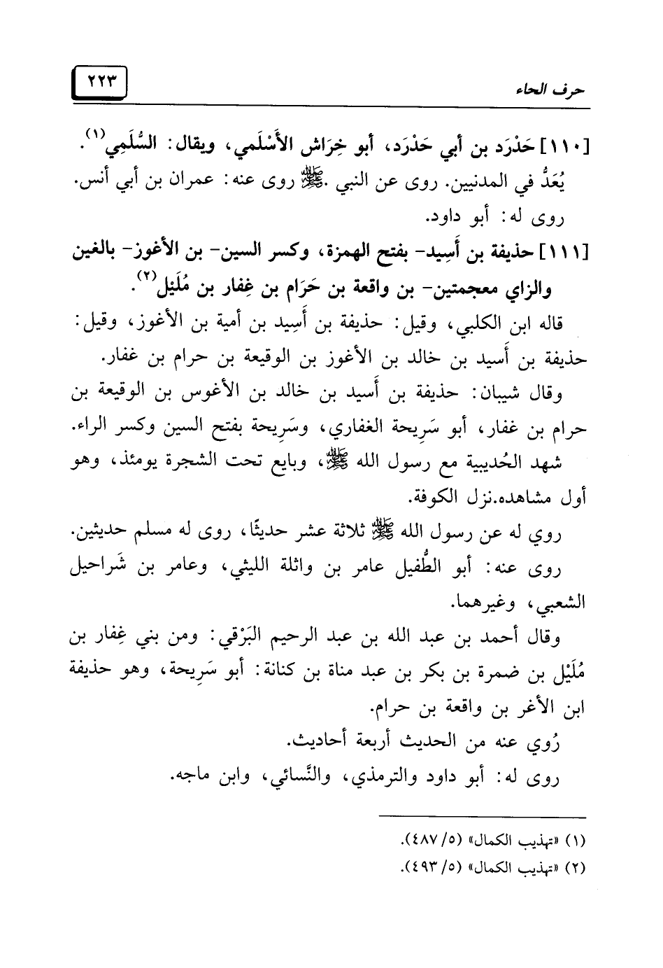 [١١١] حذيفة بن أَسِيد -بفتح الهمزة، وكسر السين- بن الأغوز -بالغين والزاي معجمتين- بن واقعة بن حَرَام بن غِفار بن مُلَيْل (¬٢).