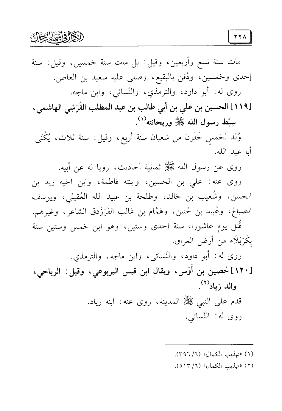 [١١٩] الحسين بن علي بن أبي طالب بن عبد المطلب القُرَشِي الهاشمي، سِبْط رسول الله -صَلَّى اللهُ عَلَيْهِ وَسَلَّمَ- وريحانته (¬١).