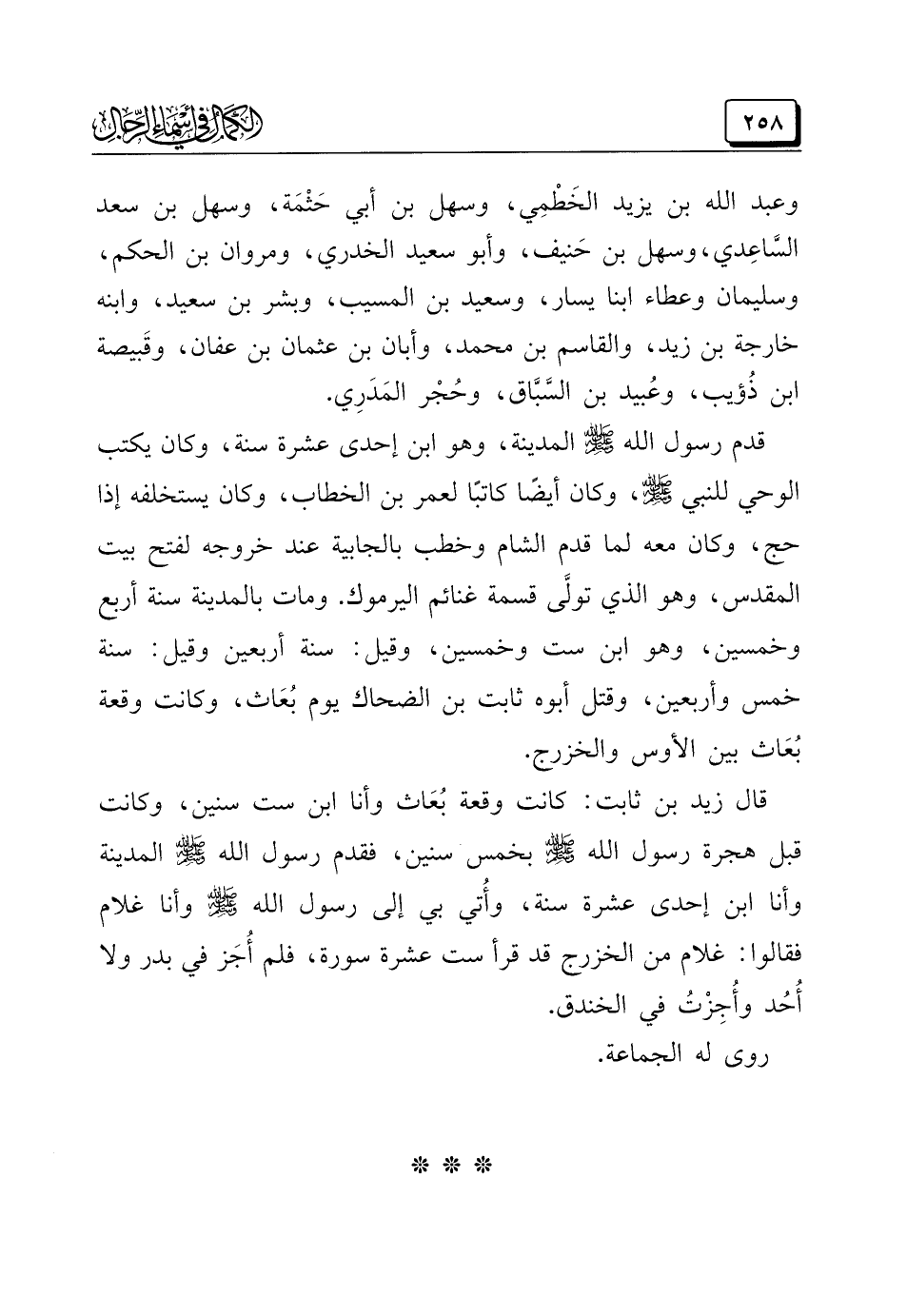 قال زيد بن ثابت: كانت وقعة بُعَاث وأنا ابن ست سنين، وكانت قبل هجرة رسول الله -صَلَّى اللهُ عَلَيْهِ وَسَلَّمَ- بخمس سنين، فقدم رسول الله -صَلَّى اللهُ عَلَيْهِ وَسَلَّمَ- المدينة وأنا ابن إحدى عشرة سنة، وأُتي بي إلى رسول الله -صَلَّى اللهُ عَلَيْهِ وَسَلَّمَ- وأنا غلام فقالوا: غلام من الخزرج قد قرأ ست عشرة سورة، فلم أُجَز في بدر ولا أحد وأُجِزْتُ في الخندق.