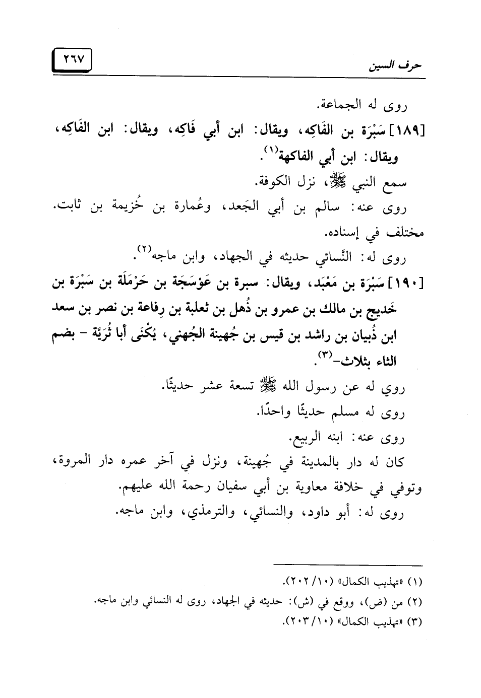 [١٨٩] سَبْرَة بن الفَاكِه، ويقال: ابن أبي فَاكِه، ويقال: ابن الفَاكِه، ويقال: ابن أبي الفاكهة (¬١).