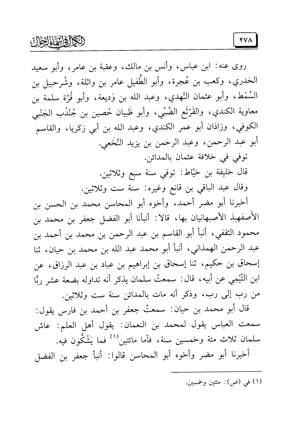 أخبرنا أبو مضر أحمد، وأخوه أبو المحاسن محمد بن الحسن بن الأَصفهبذ الأصبهانيان بها، قالا: أنبأنا أبو الفضل جعفر بن محمد بن محمود الثقفي، أنبأ أبو القاسم بن عبد الرحمن بن محمد بن أحمد بن عبد الرحمن الهمذاني، أنبأ أبو محمد عبد الله بن محمد بن حيان، ثنا إسحاق بن حكيم، ثنا إسحاق بن إبراهيم بن عباد بن عبد الرزاق، عن ابن التَّيْمِي عن أبيه، قال: سمعتُ سلمان يذكر أنه تداوله بضعة عشر ربًّا من رب إلى رب، وذكر أنه مات بالمدائن سنة ست وثلاثين.