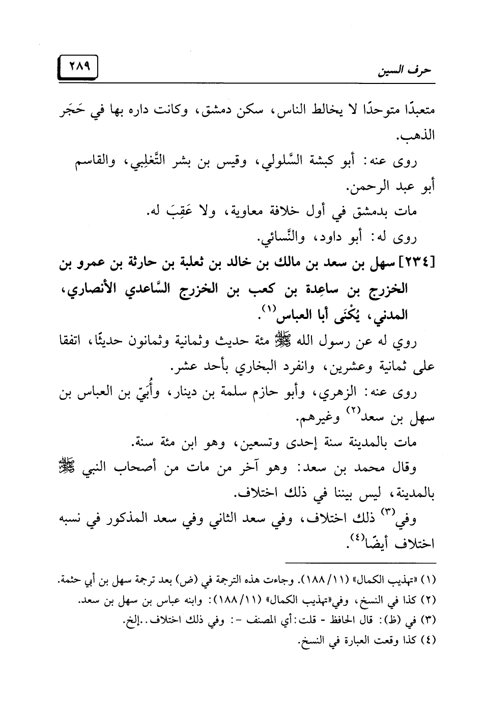 (¬١) "تهذيب الكمال" (١١/ ١٨٨). وجاءت هذه الترجمة في (ض) بعد ترجمة سهل بن أبي حثمة.