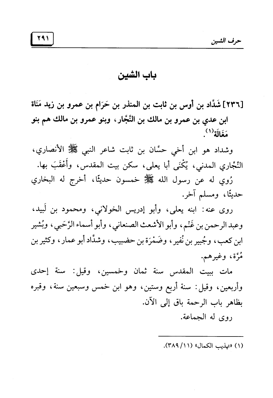 [٢٣٦] شَدَّاد بن أوس بن ثابت بن المنذر بن حَرَام بن عمرو بن زيد مَنَاة ابن عدي بن عمرو بن مالك بن النَّجَّار، وبنو عمرو بن مالك هم بنو مَغَالة (¬١).