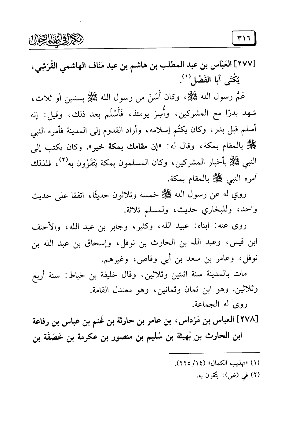 عَمُّ رسول الله -صَلَّى اللهُ عَلَيْهِ وَسَلَّمَ-، وكان أَسَنَّ من رسول الله -صَلَّى اللهُ عَلَيْهِ وَسَلَّمَ- بسنتين أو ثلاث، شهد بدرًا مع المشركين، وأُسِرَ يومئذ، فَأَسْلَم بعد ذلك، وقيل: إنه أسلم قبل بدر، وكان يكتُم إسلامه، وأراد القدوم إلى المدينة فأمره النبي -صَلَّى اللهُ عَلَيْهِ وَسَلَّمَ- بالمقام بمكة، وقال له: "إن مقامك بمكة خير". وكان يكتب إلى النبي -صَلَّى اللهُ عَلَيْهِ وَسَلَّمَ- بأخبار المشركين، وكان المسلمون بمكة يَتَقَوَّون به (¬٢)، فلذلك أمره النبي -صَلَّى اللهُ عَلَيْهِ وَسَلَّمَ- بالمقام بمكة.